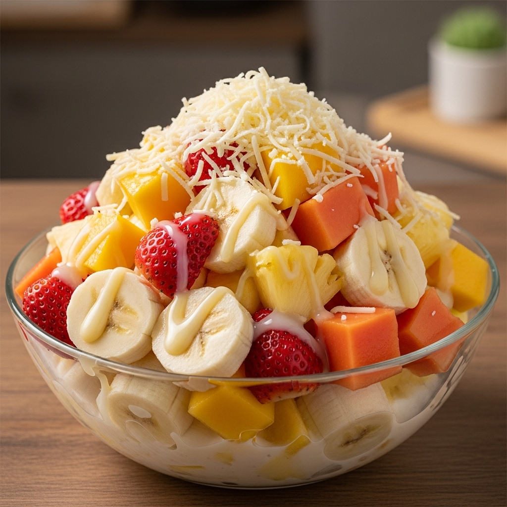 Banano, fresa, mango, piña, papaya, manzana, bañada en crema de leche, lecherita y una generosa capa de queso rallado.