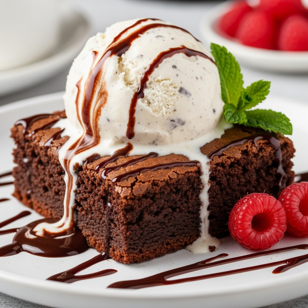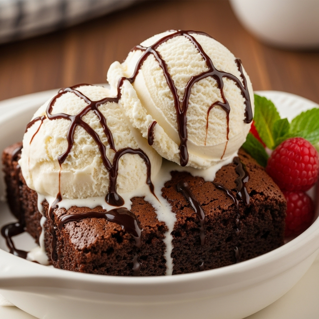 Delicioso brownie acompañado de 1 sabor de helado, abanico, salsa de chocolate, salsa dulce de la casa y chips crocantes.
