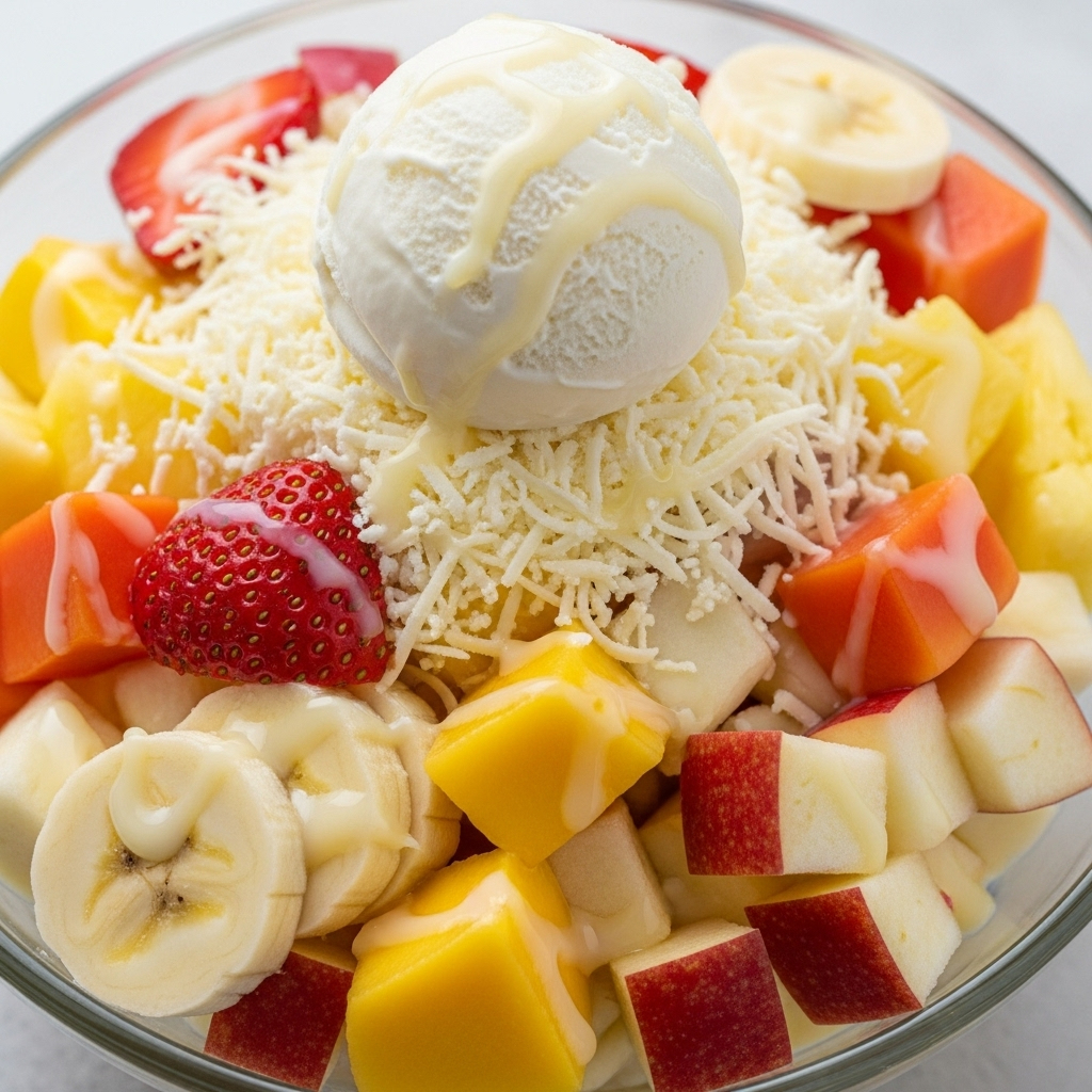 Banano, fresa, mango, piña, papaya, manzana, bañada en crema de leche, lecherita y una generosa capa de queso rallado, 1 bola de helado a eleccion.