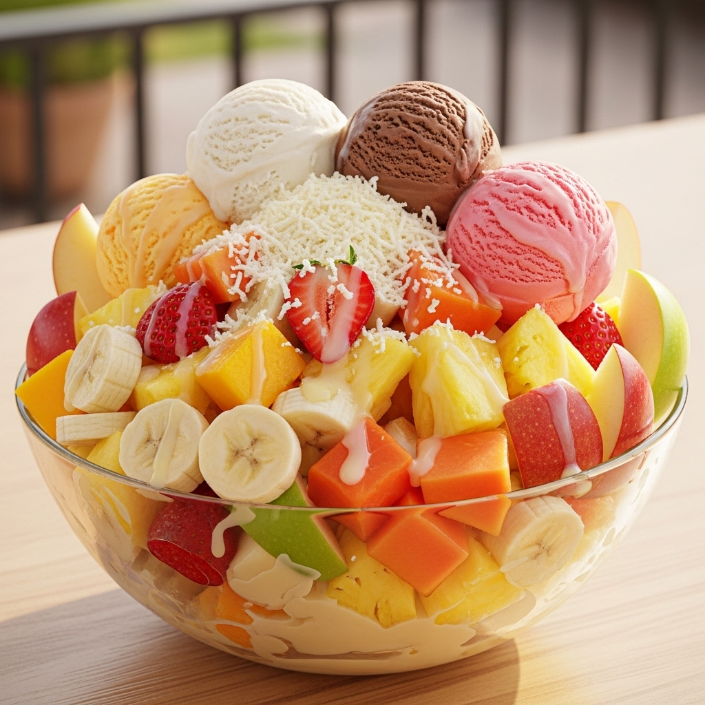 Banano, fresa, mango, piña, papaya, manzana, bañada en crema de leche, lecherita y una generosa capa de queso rallado, 5 bolas de helado a eleccion.