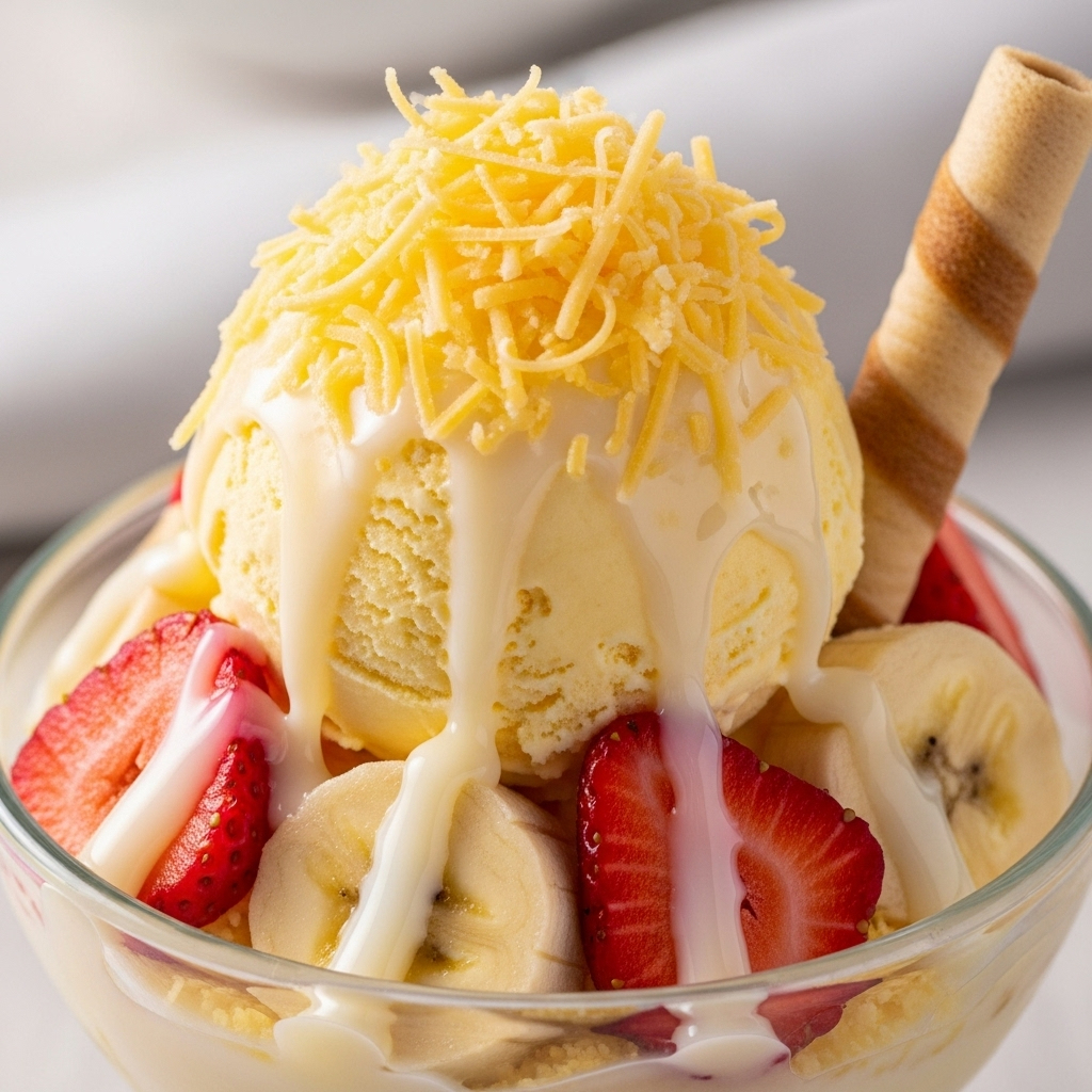 Una mezcla única de 2 sabor de helado, fresas, banano, lechera, barquillo y una capa generosa de queso rallado.