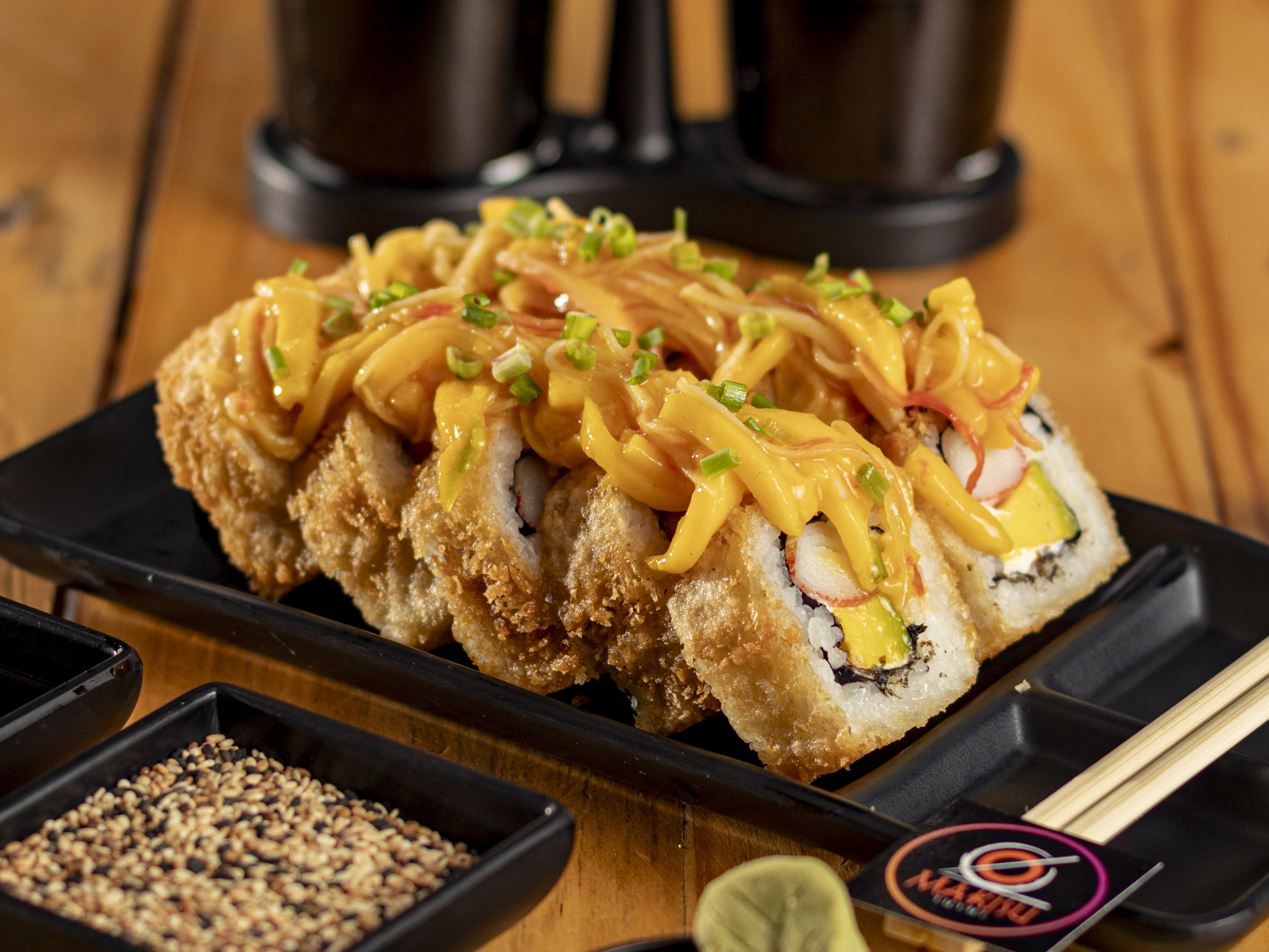 Crujientes bocados tempurados en panko, rellenos de queso crema, aguacate y salmón, con delicioso topping de kanikama en una cremosa salsa hot.