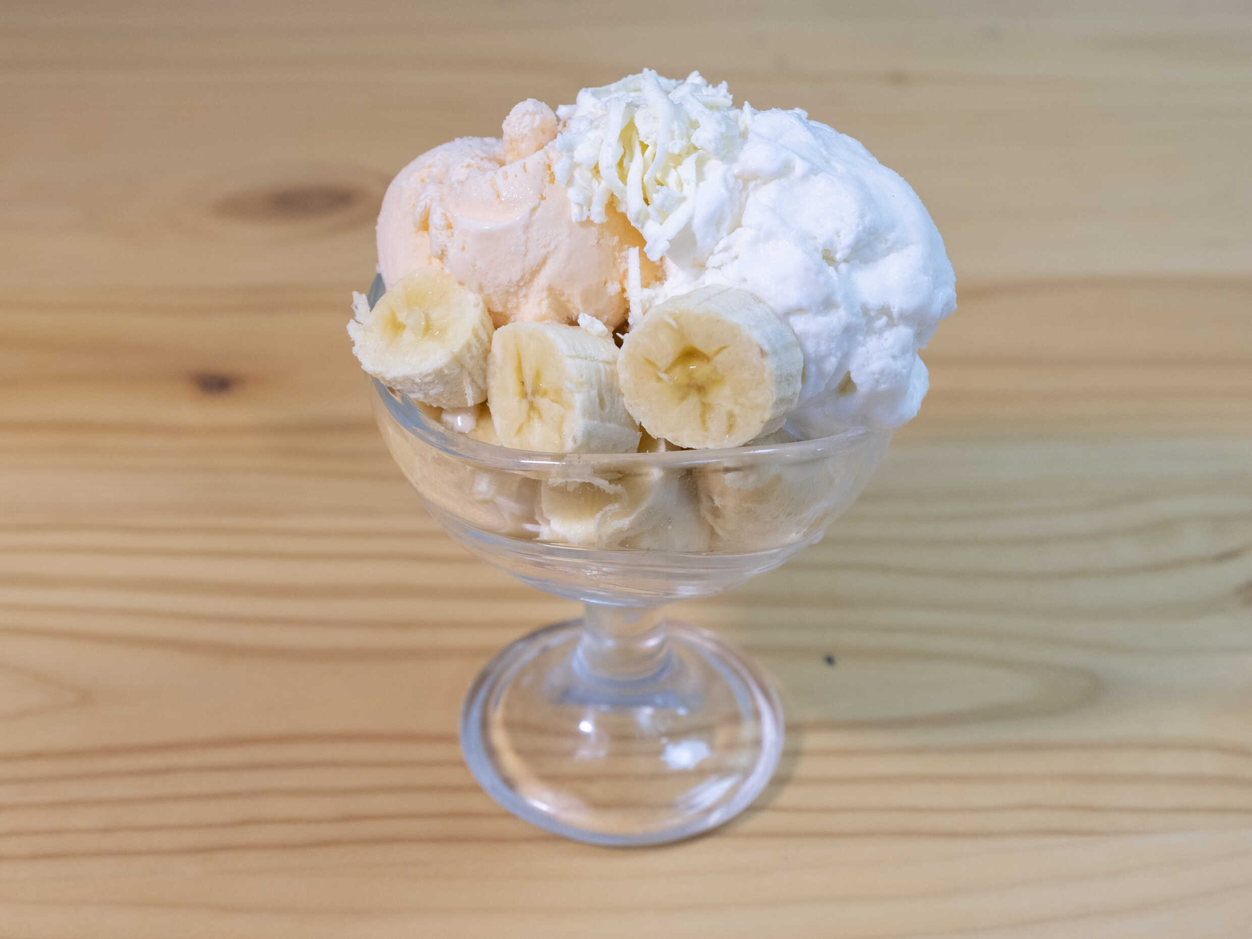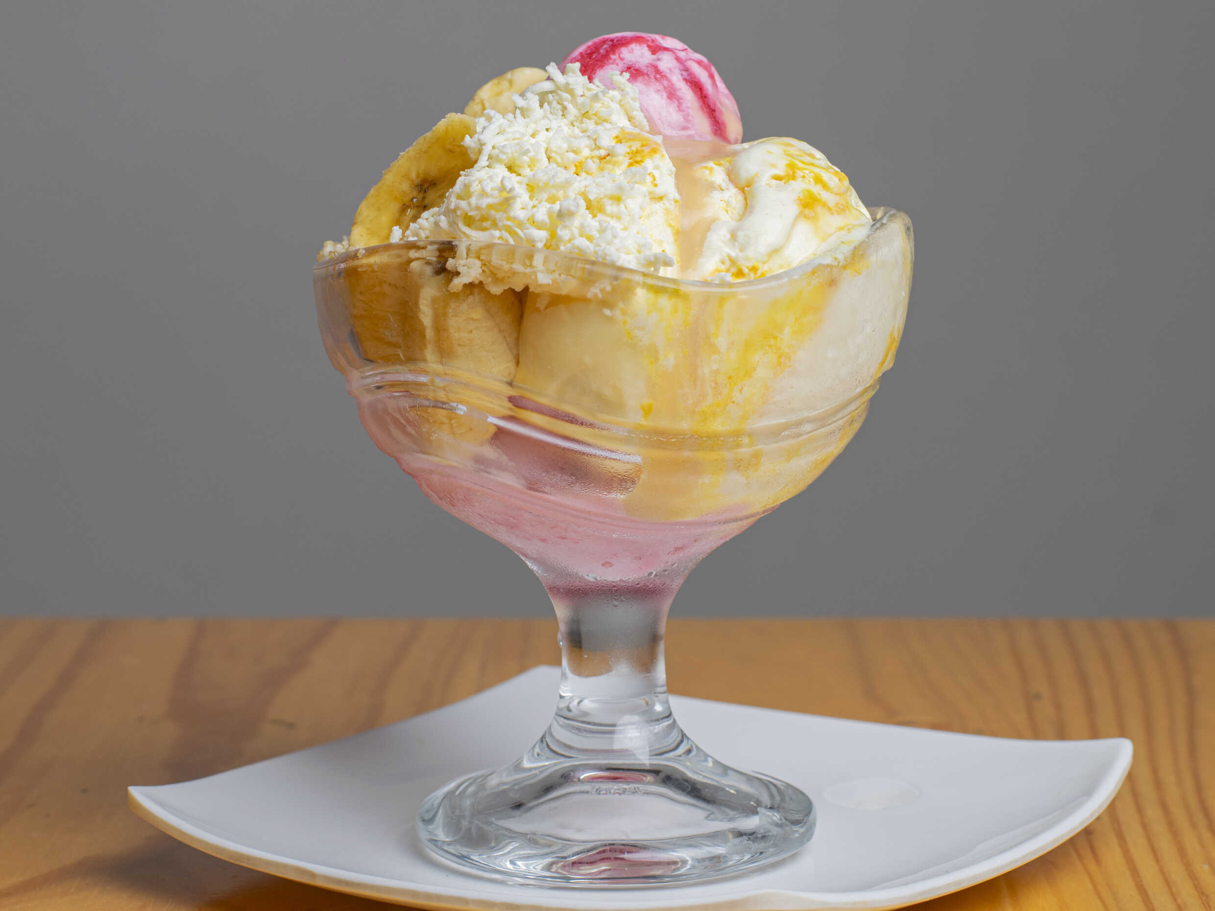 Banano, 2 bolas de helado, crema de leche y queso