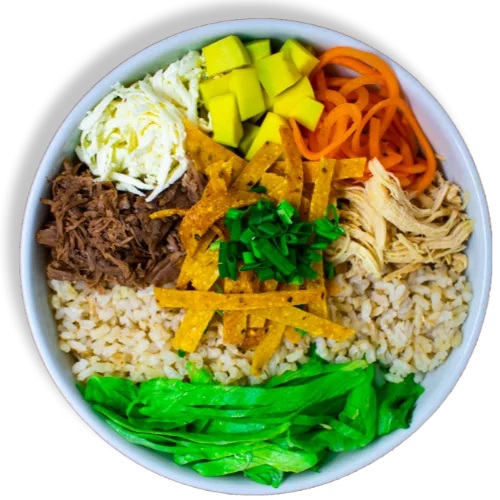 Arroz integral, lechuga, carne desmechada, pollo desmechado, cebolla caramelizada, zanahoria, aguacate, queso, tortilla chip y cebollín.