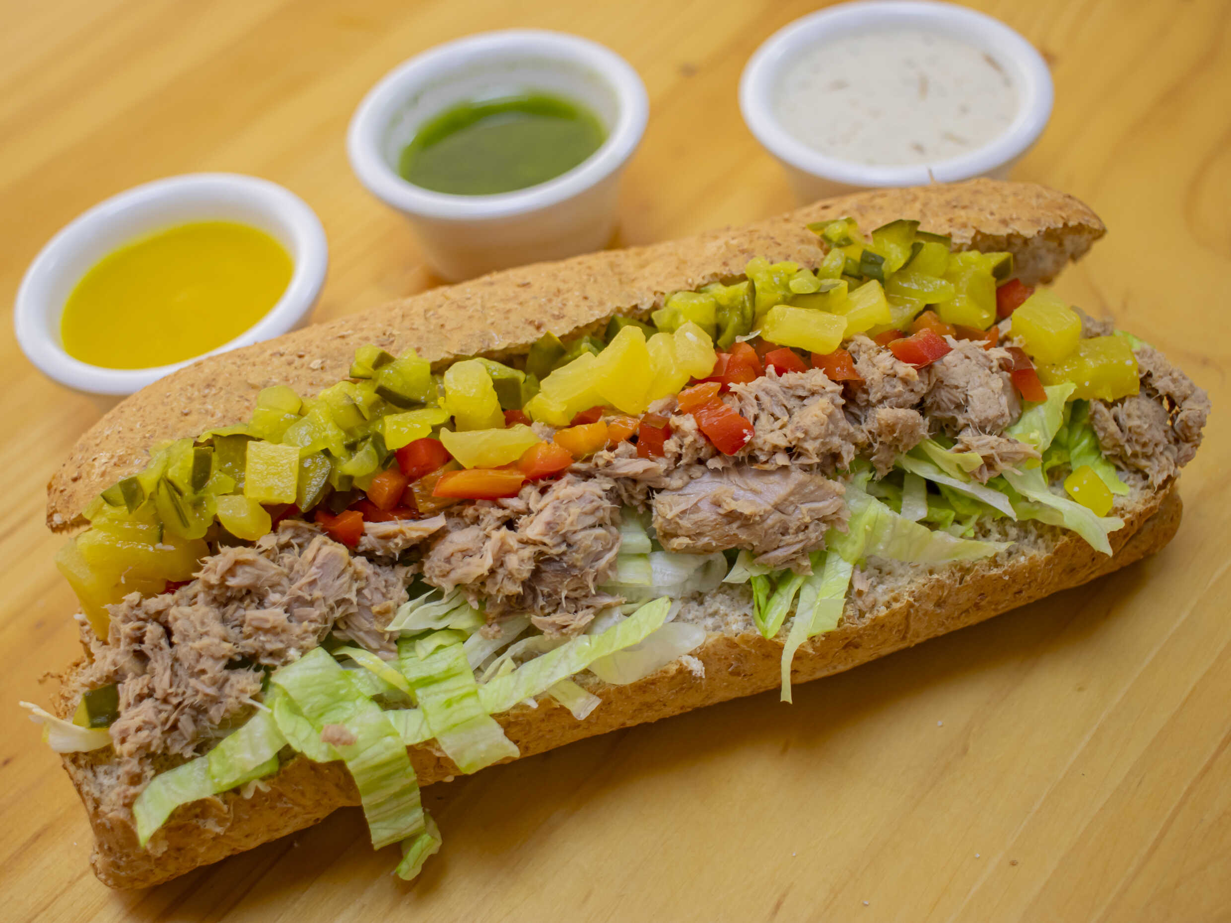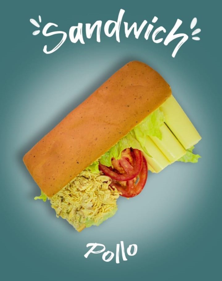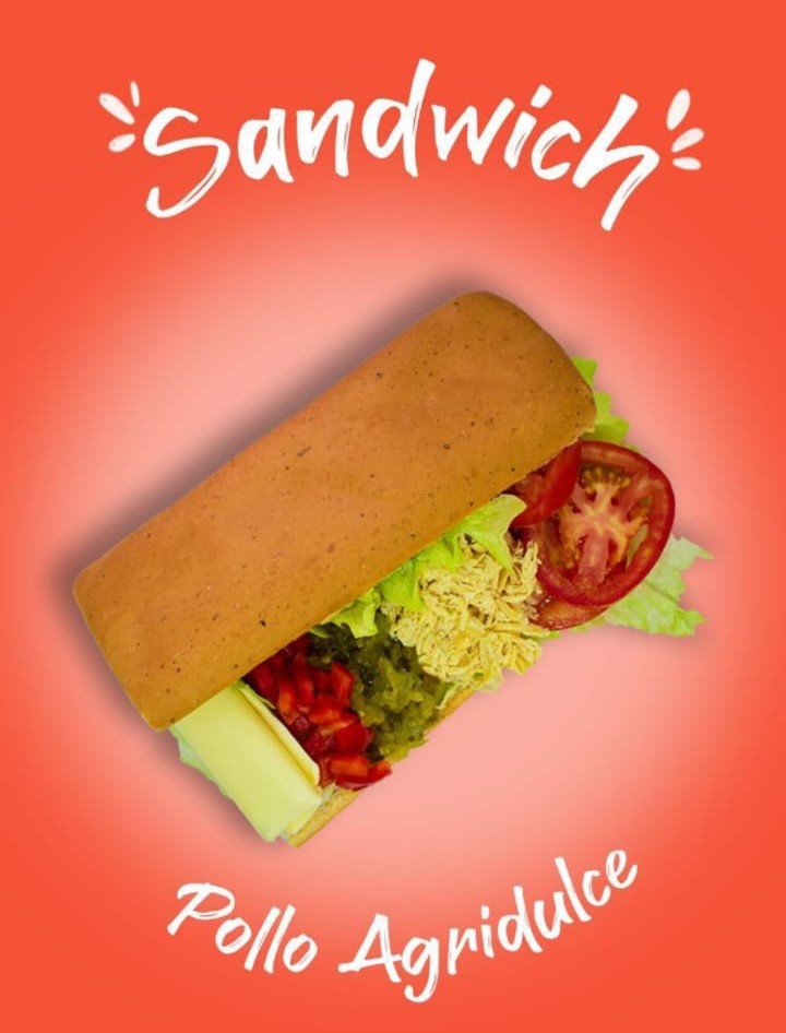 Pollo, queso mozzarella, pimentón, pepinillo, lechuga, tomate con salsa miel mostaza.
