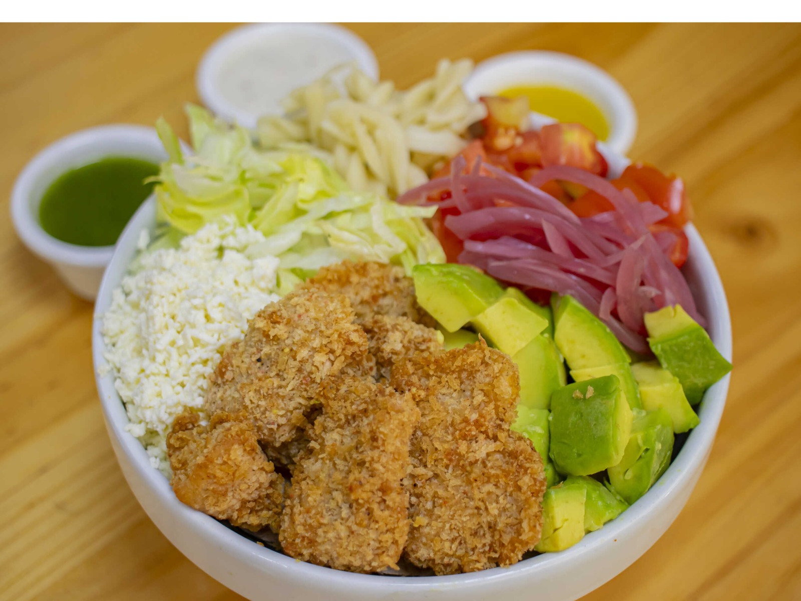 Pechuga de pollo apanado en trocitos, miel moztasa, aguacate, tomates cebolla morada (opcional, queso rallado)