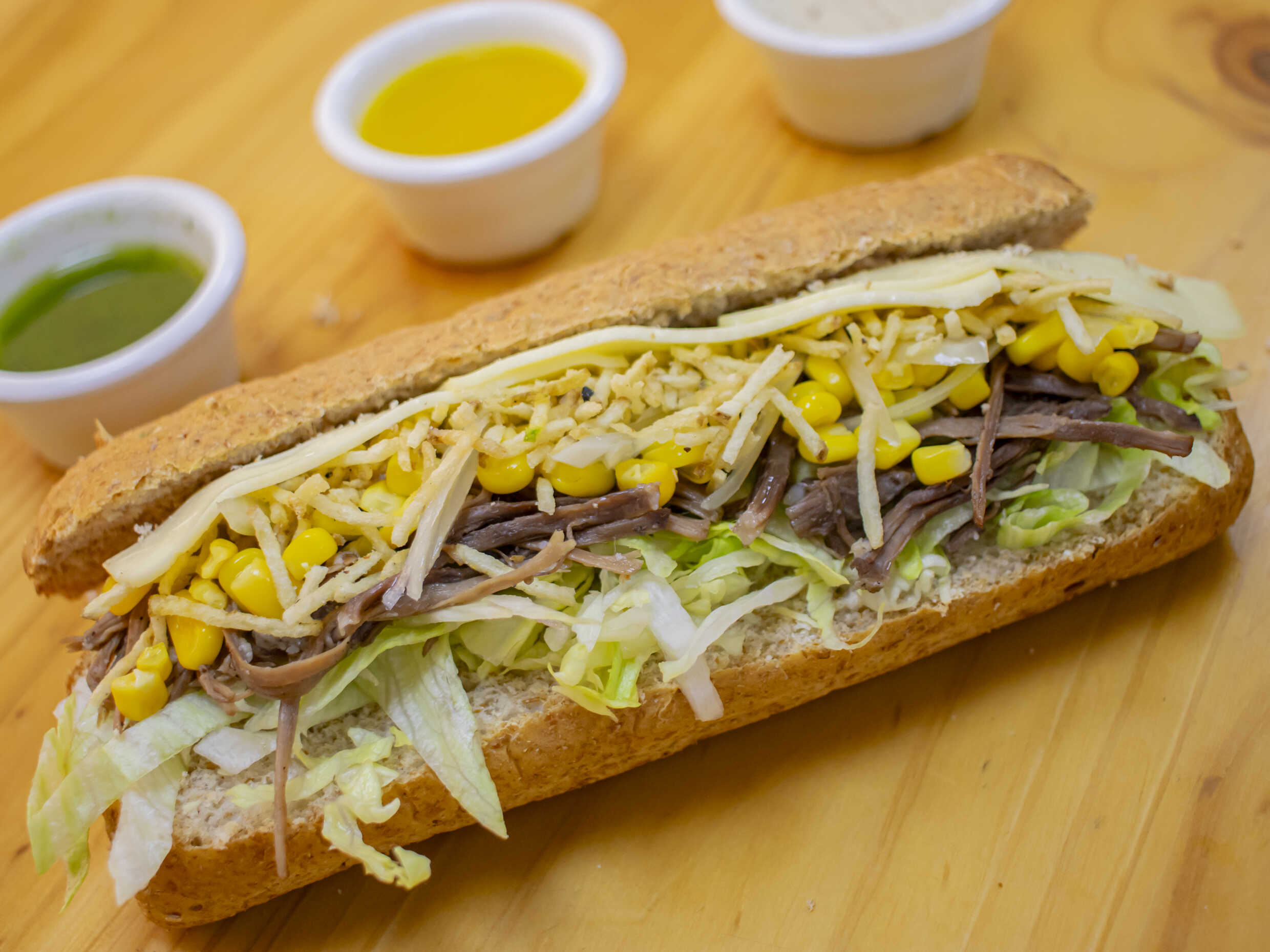 Carne desmechada, lechuga, cebolla caramelizada, papitas fosforito, queso mozzarella y maicitos.