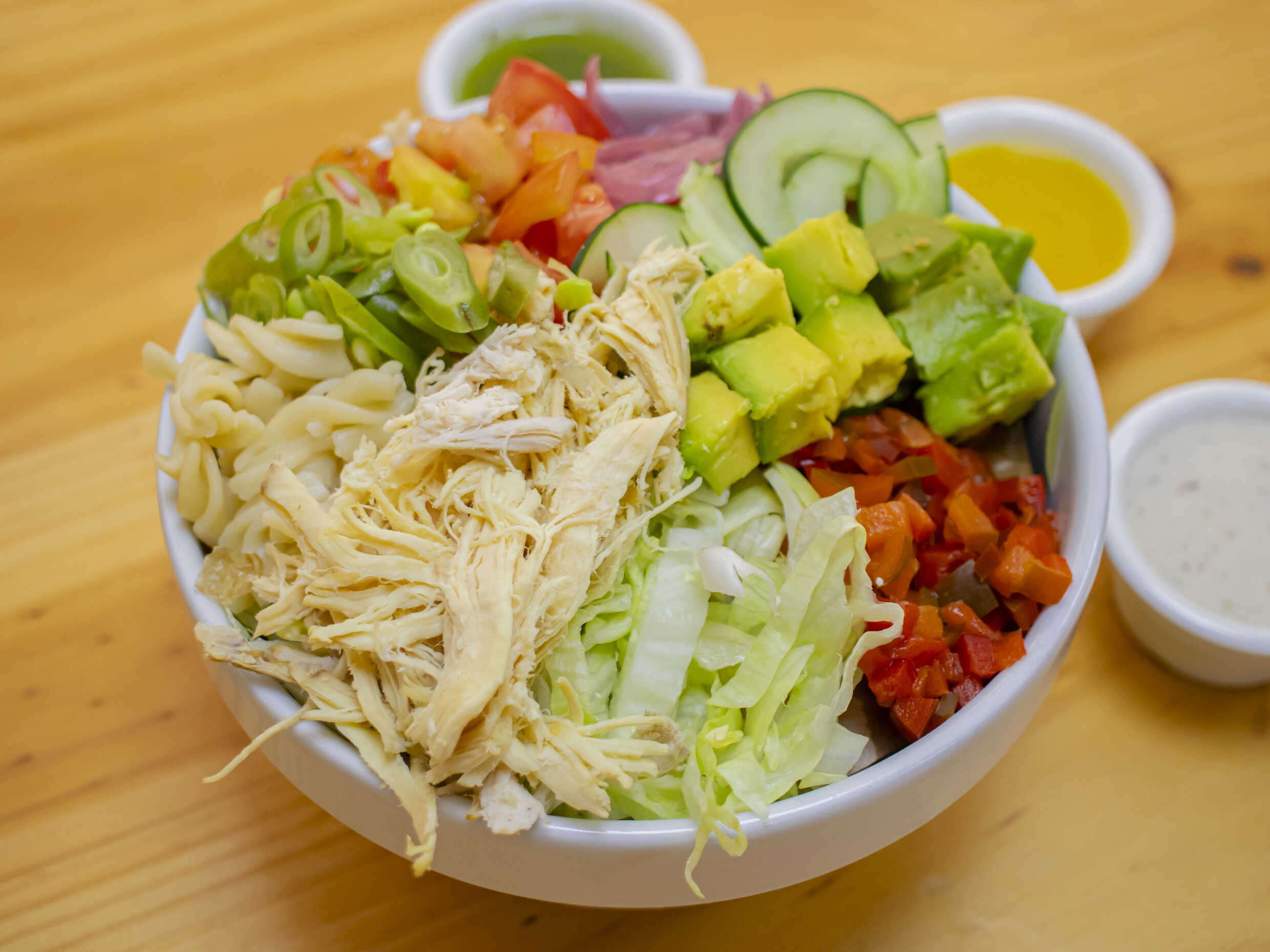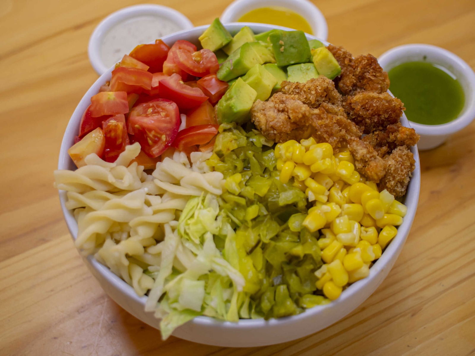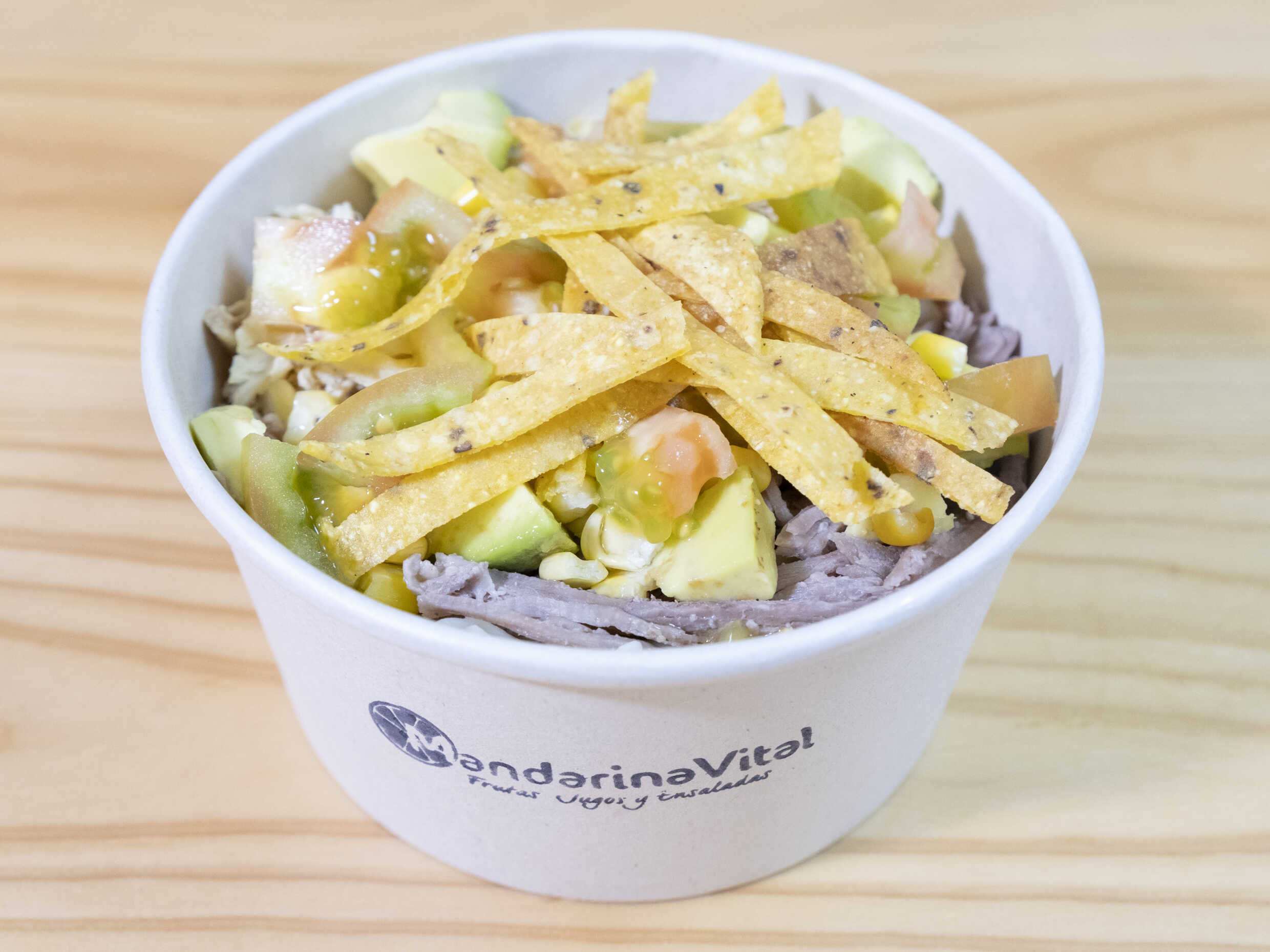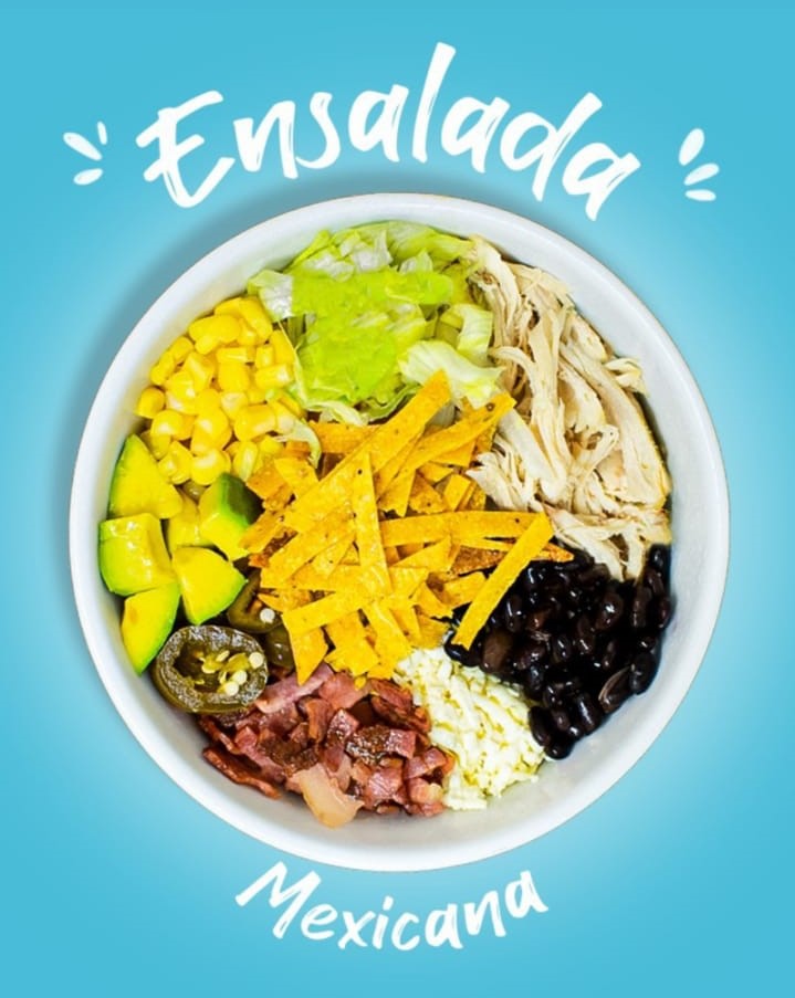 Pollo, tocineta, mix de lechugas, aguacate, maicito, frijol caraota, queso rallado, jalapeños y tortilla chip.