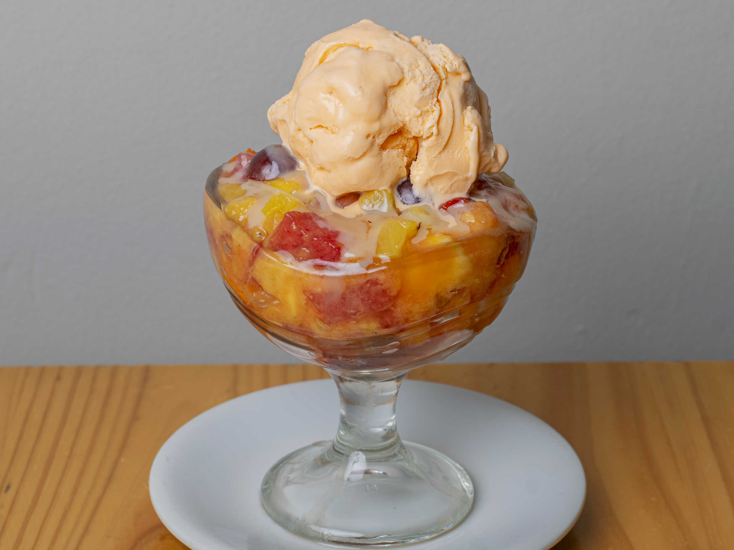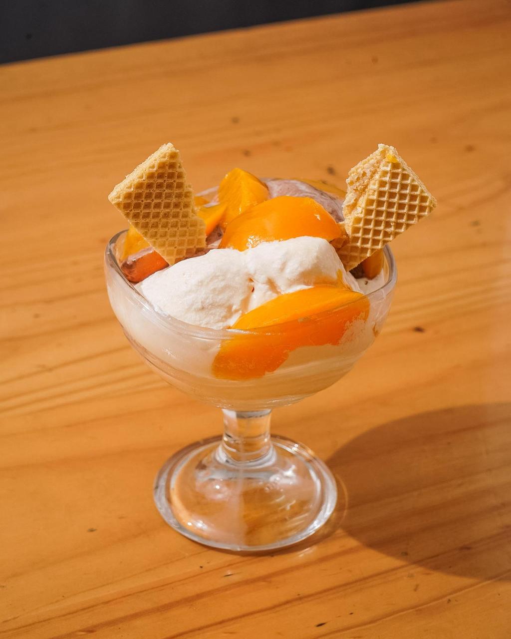 2 bolas de helado de tu elección, rodajas de durazno y leche condensada