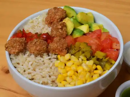 Pollo Crispi, Arroz integral,tomate, pepinillo dulce, pico de gallo y Aguacate.