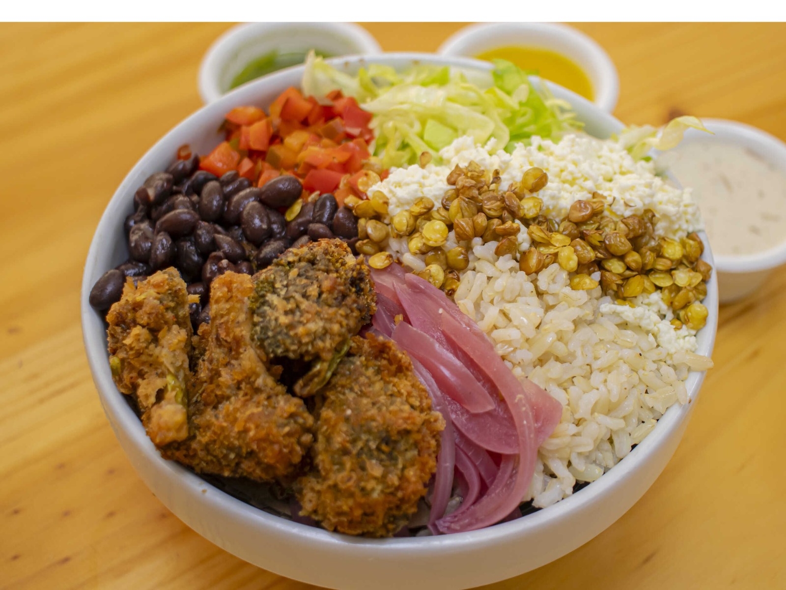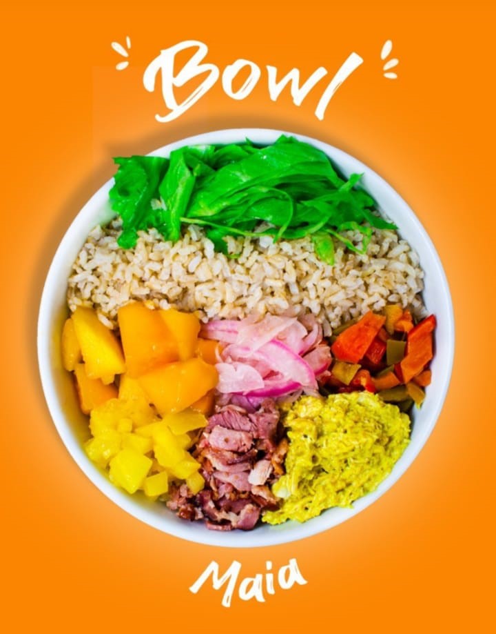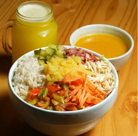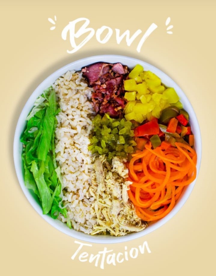 Bowl de 26 oz, arroz integral, pollo desmechado, tocineta, zanahoria, pepinillos dulces, lechuga, piña calada, pimentón encurtido, sopa del día o porción de fruta y bebida.