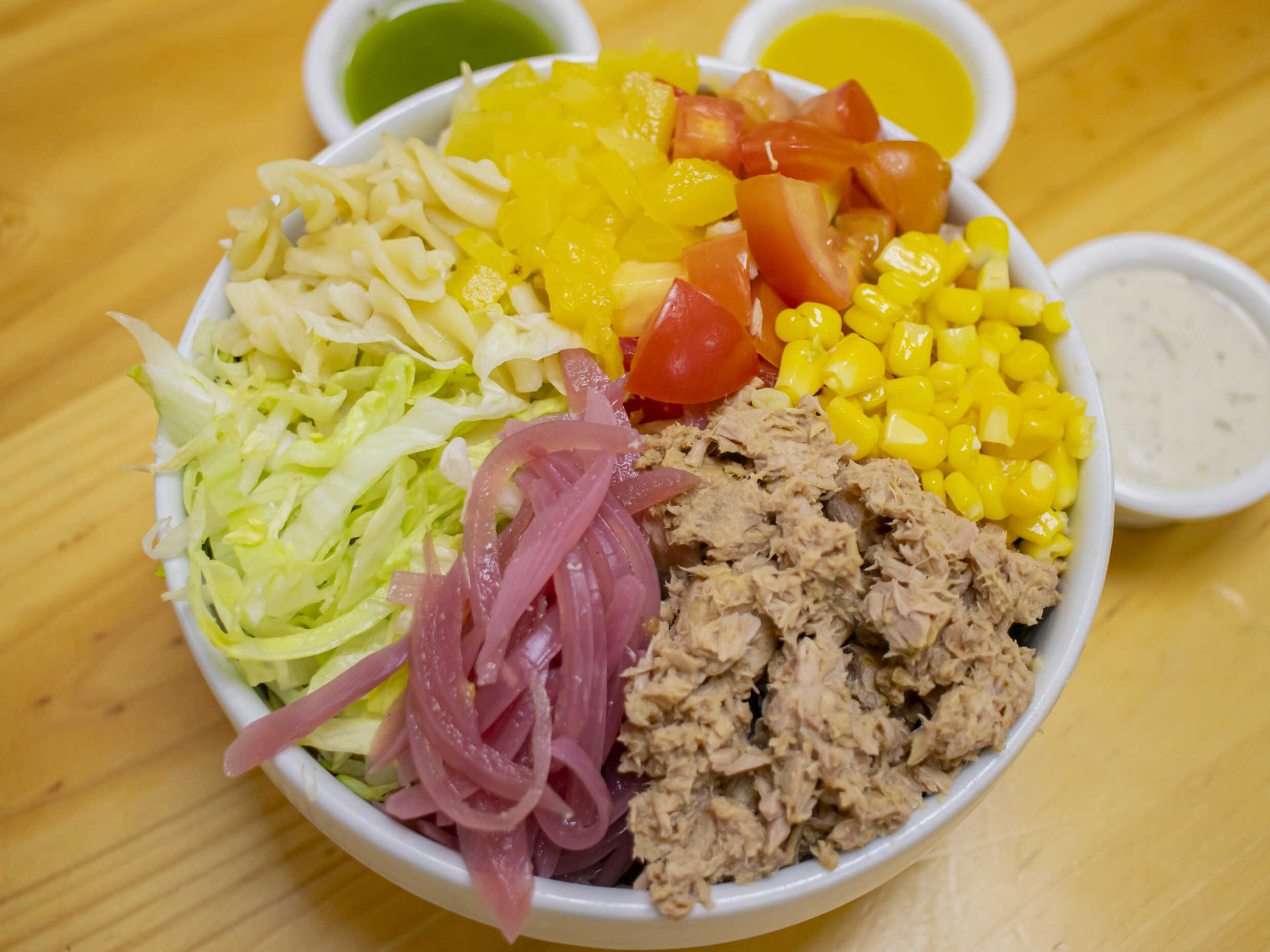 atún, tomate, cebolla morada, maicitos y piña calada