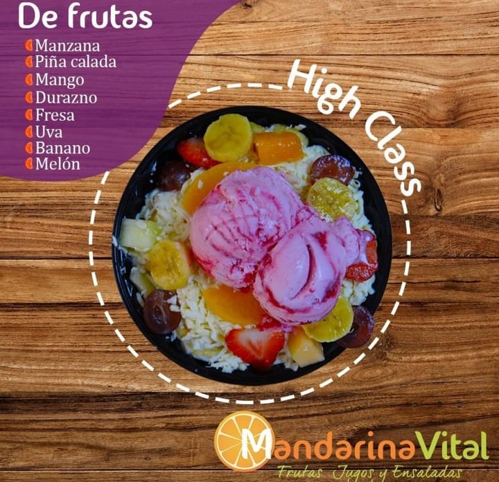 Ensalada High Class Con Helado*2 (Manzana, piña calada, mango, durazno, fresas, uvas, banano, melón, leche condensada, crema de leche, queso rallado, coco rallado, helado de tu preferencia)