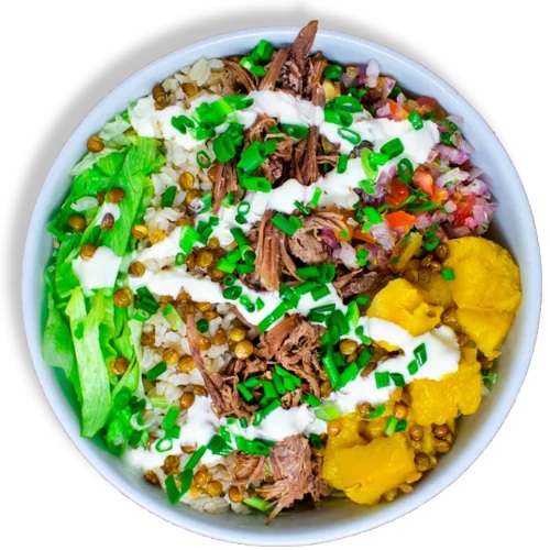 con arroz integral, lechuga, carne desmechada, maduro, lentejas crocantes, pico de gallo, sour cream y cebollín.