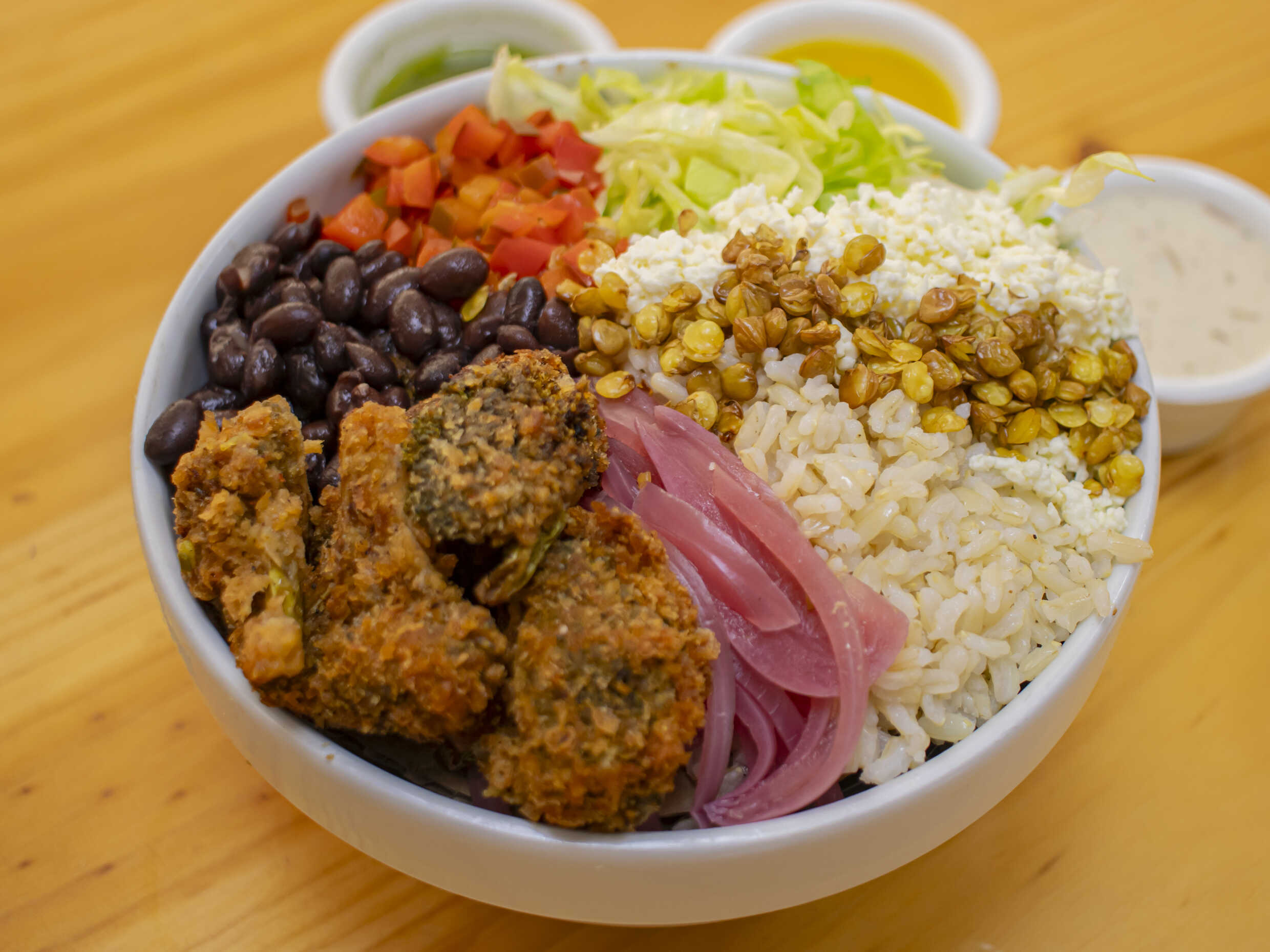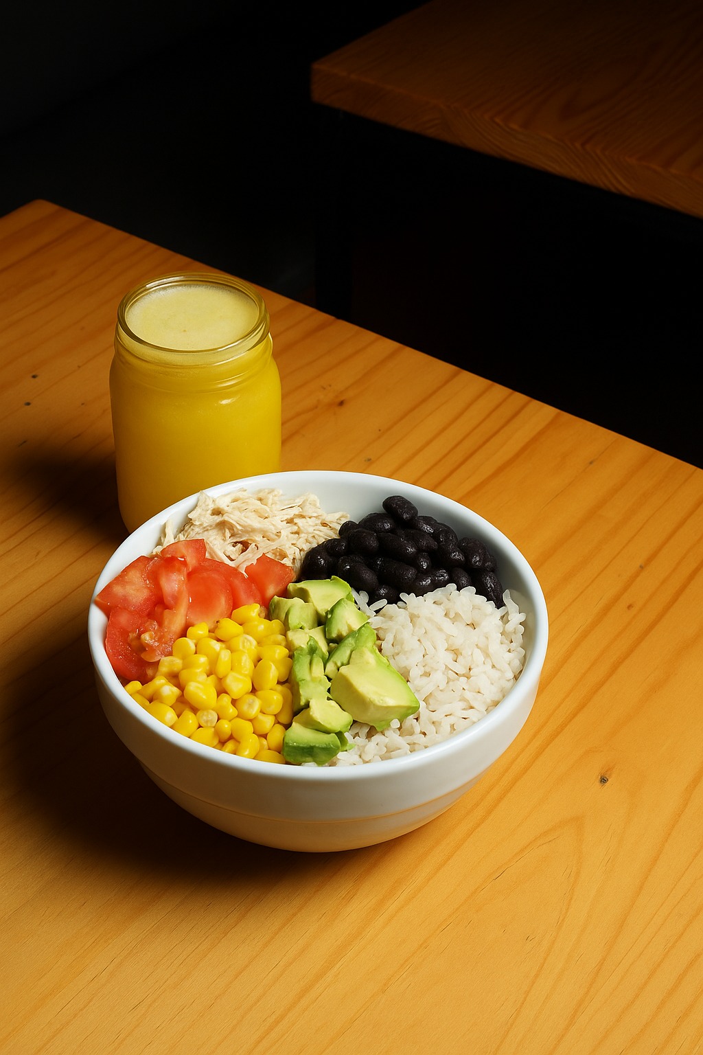 Arroz integral, mix de lechugas, pollo desmechado, frijol caraota, maicitos, tomate y aguacate.