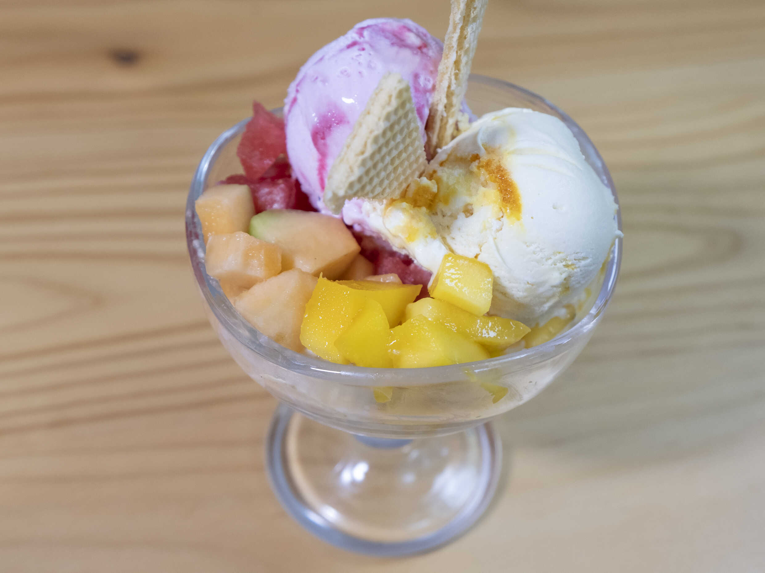 2 bolas de helado de tu elección y mix de frutas picadas alrededor con dos galletas waffer