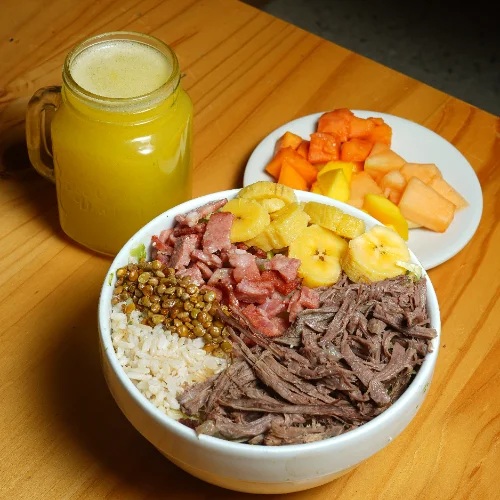 Bowl de 26 oz, arroz integral, lechuga, carne desmechada, maduro, tocineta y lentejas crocantes. acompañado de sopa del día o porción de fruta y bebida.