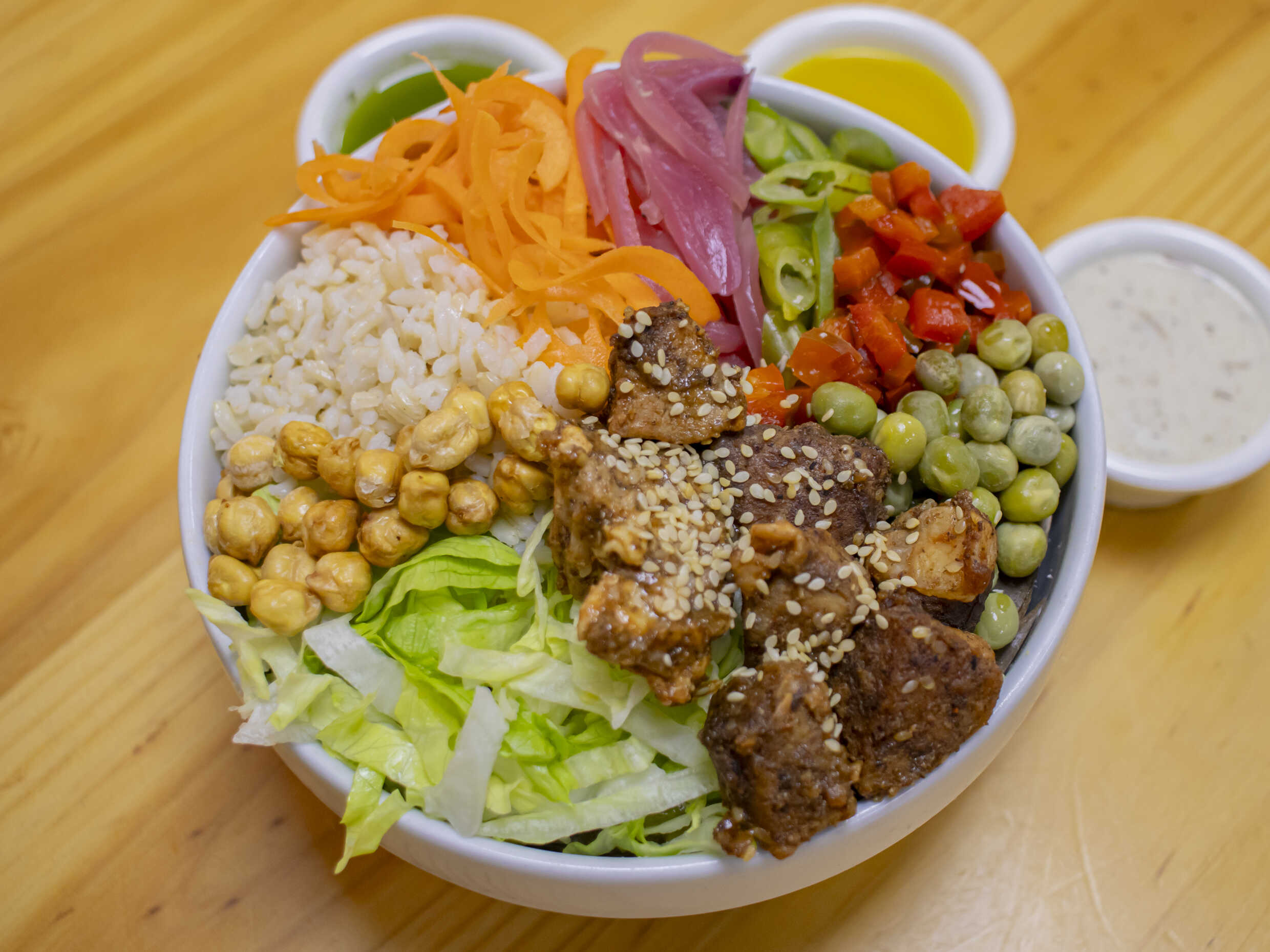Arroz integral, lechuga, pollo desmechado, zucchini, cebolla marinada, pimentón encurtido, aceitunas, garbanzo crocante, cilantro y ajonjolí.