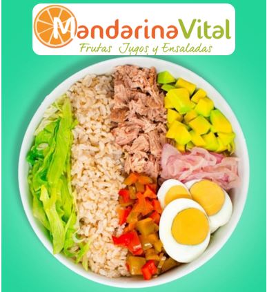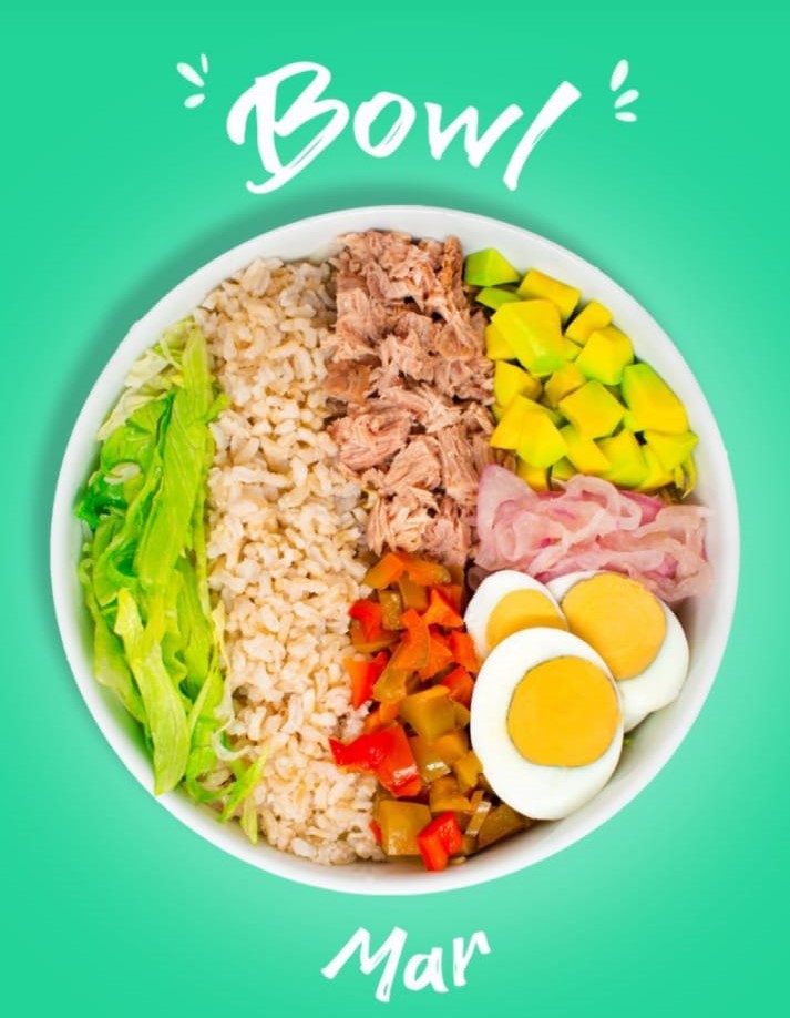 Arroz integral, mix de lechugas, lomitos de atún, rodajas de huevo, aguacate, pimentón y cebolla marinada en vinagre de frutas.