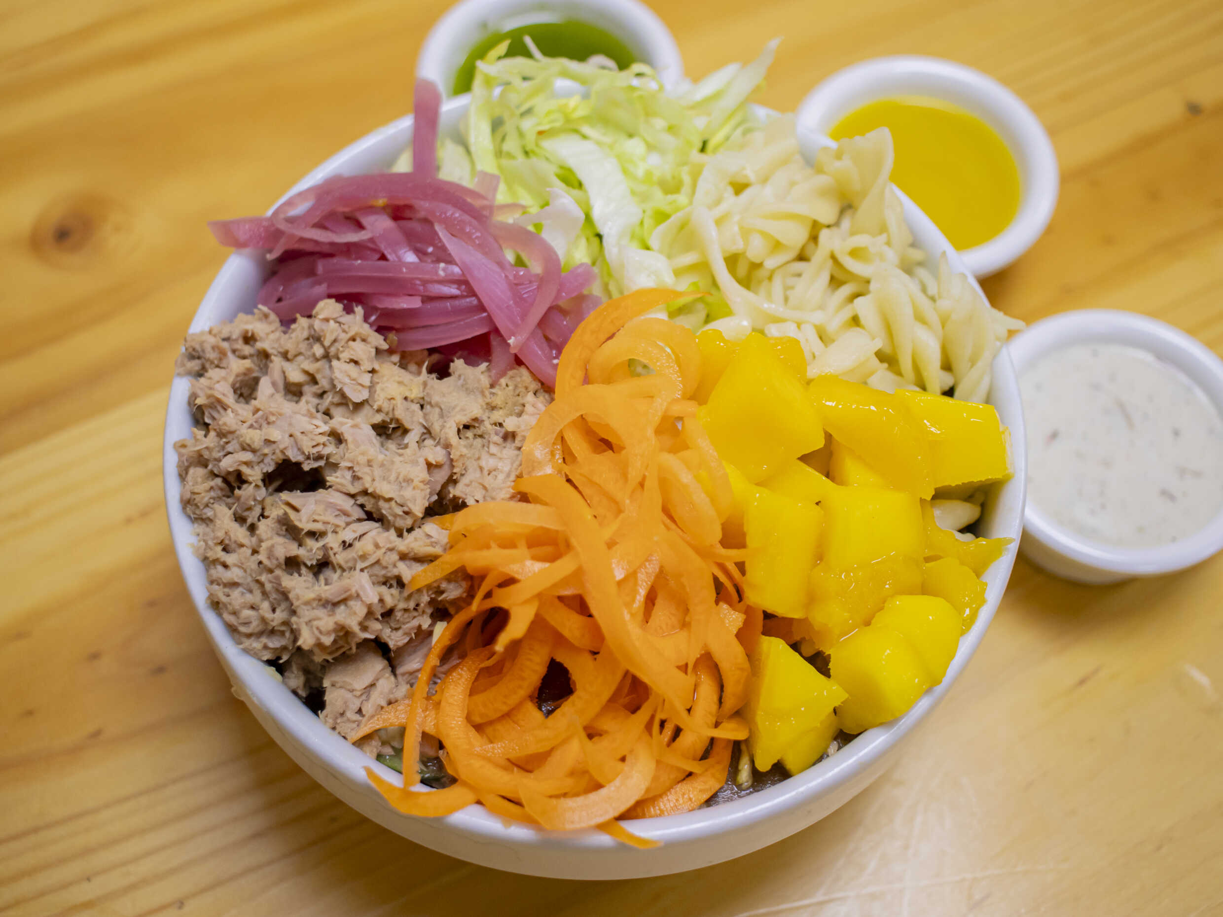 Atún, mango, pasta, cebolla morada y julianas zanahoria.