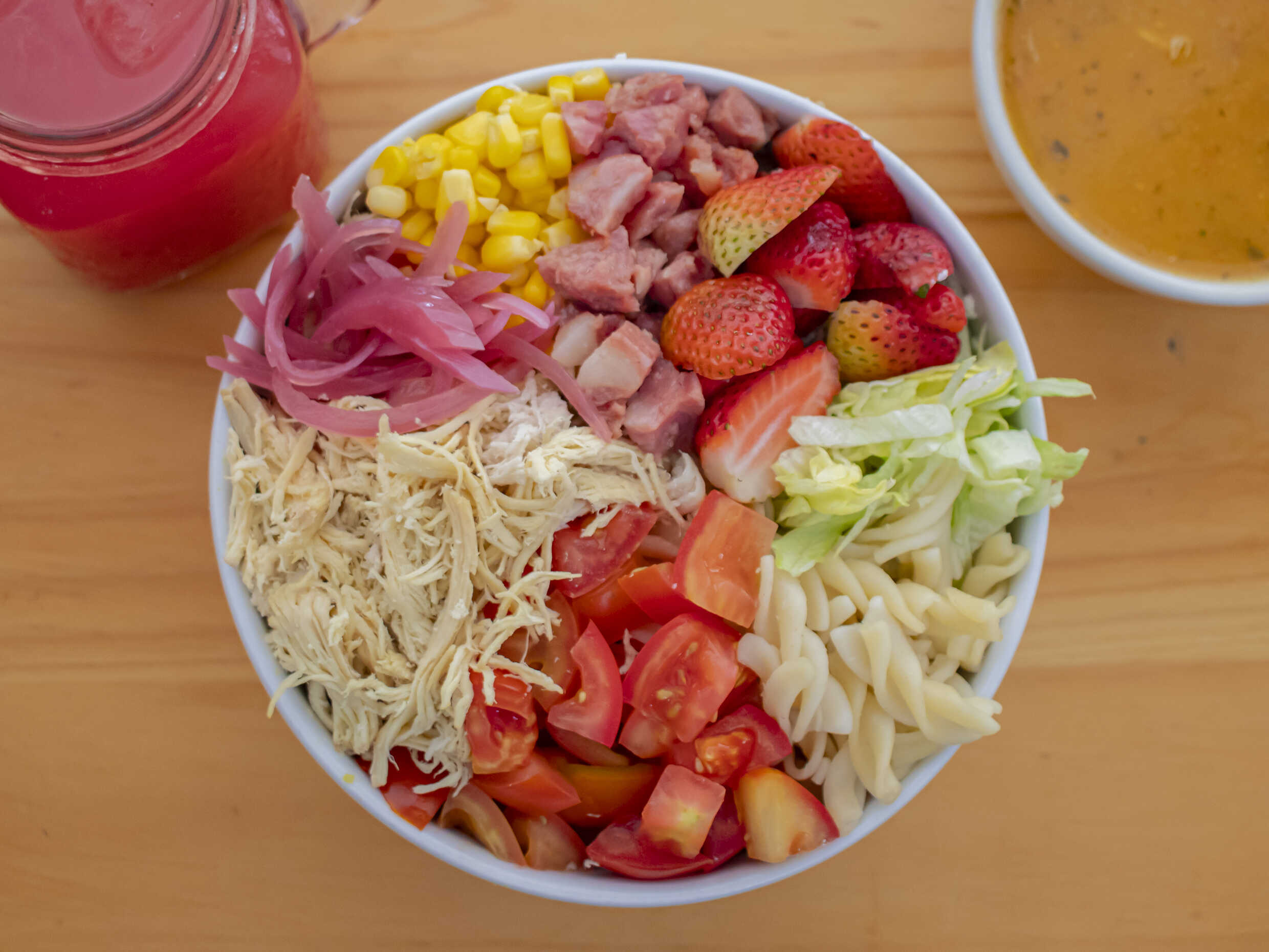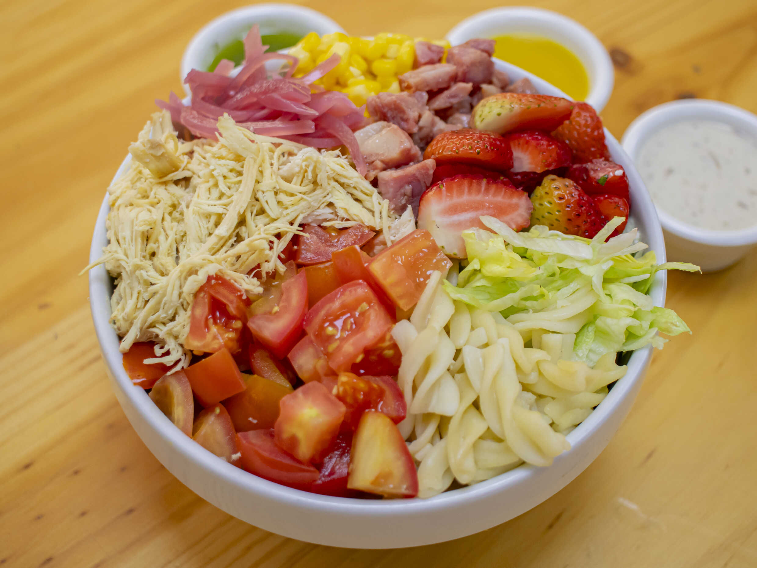 Pollo, cebolla, tomate, fresas, maicitos y tocineta
