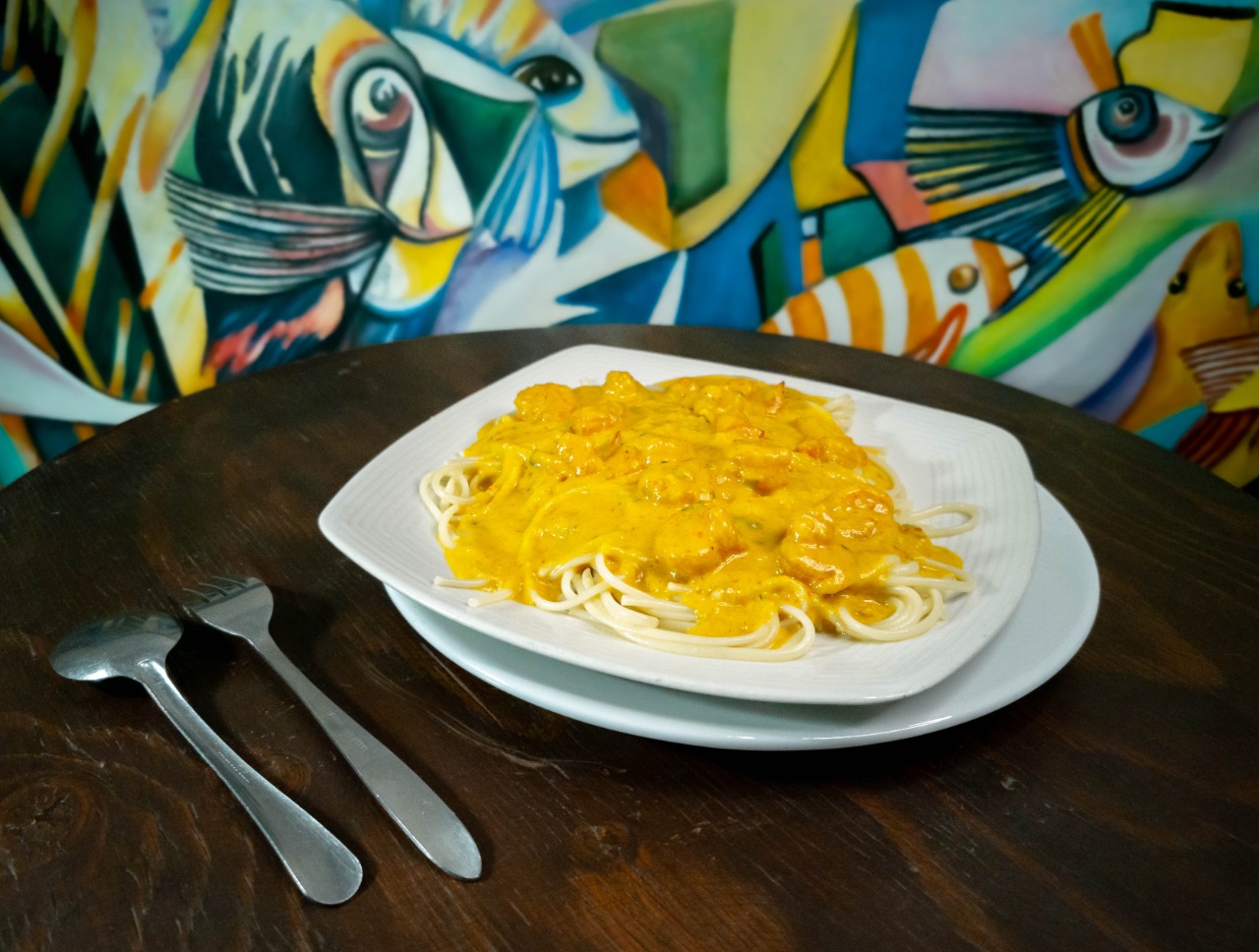 200 gr pasta en una deliciosa salsa con camarones, acompañada de tostadas y ensalada.