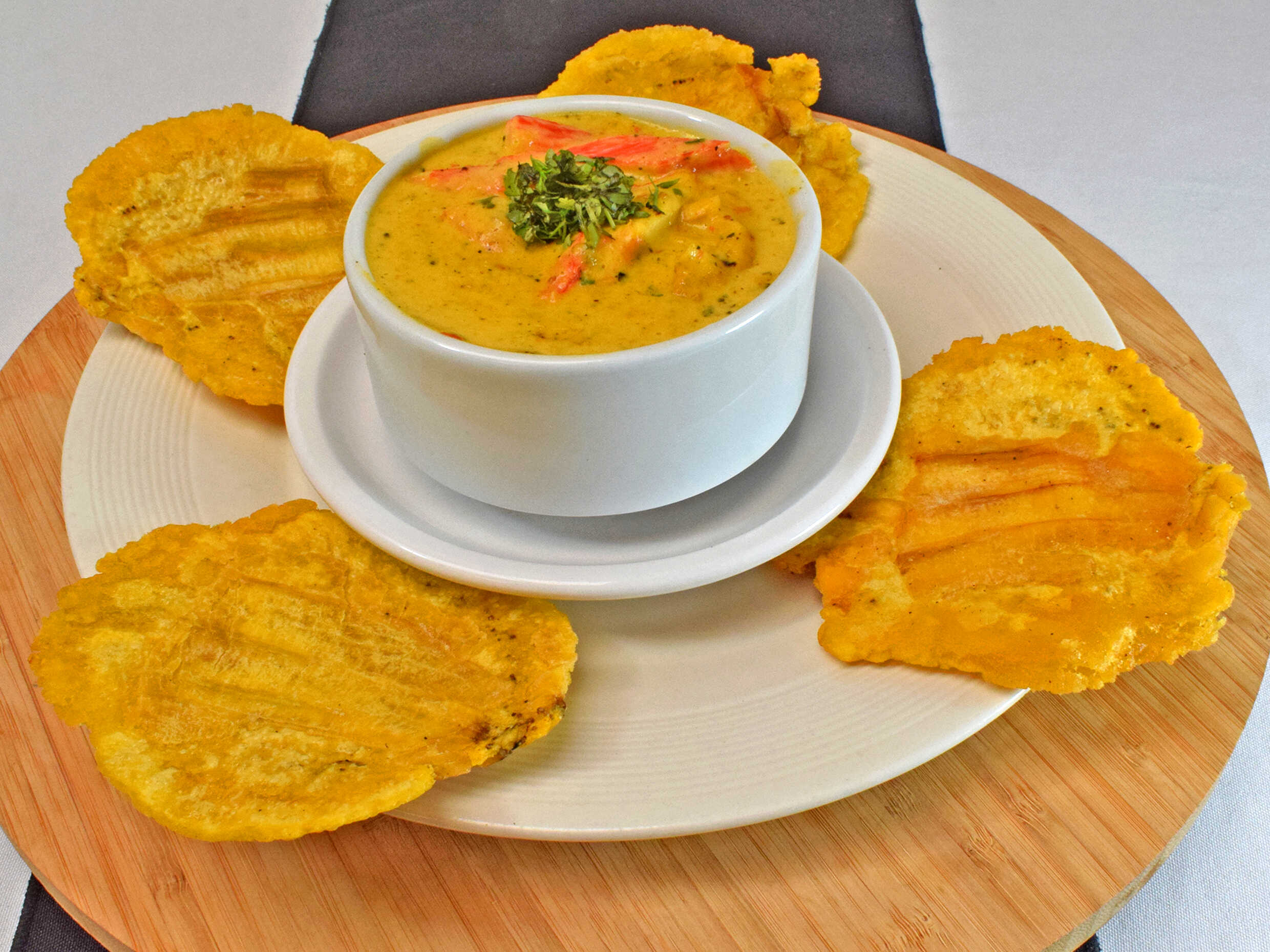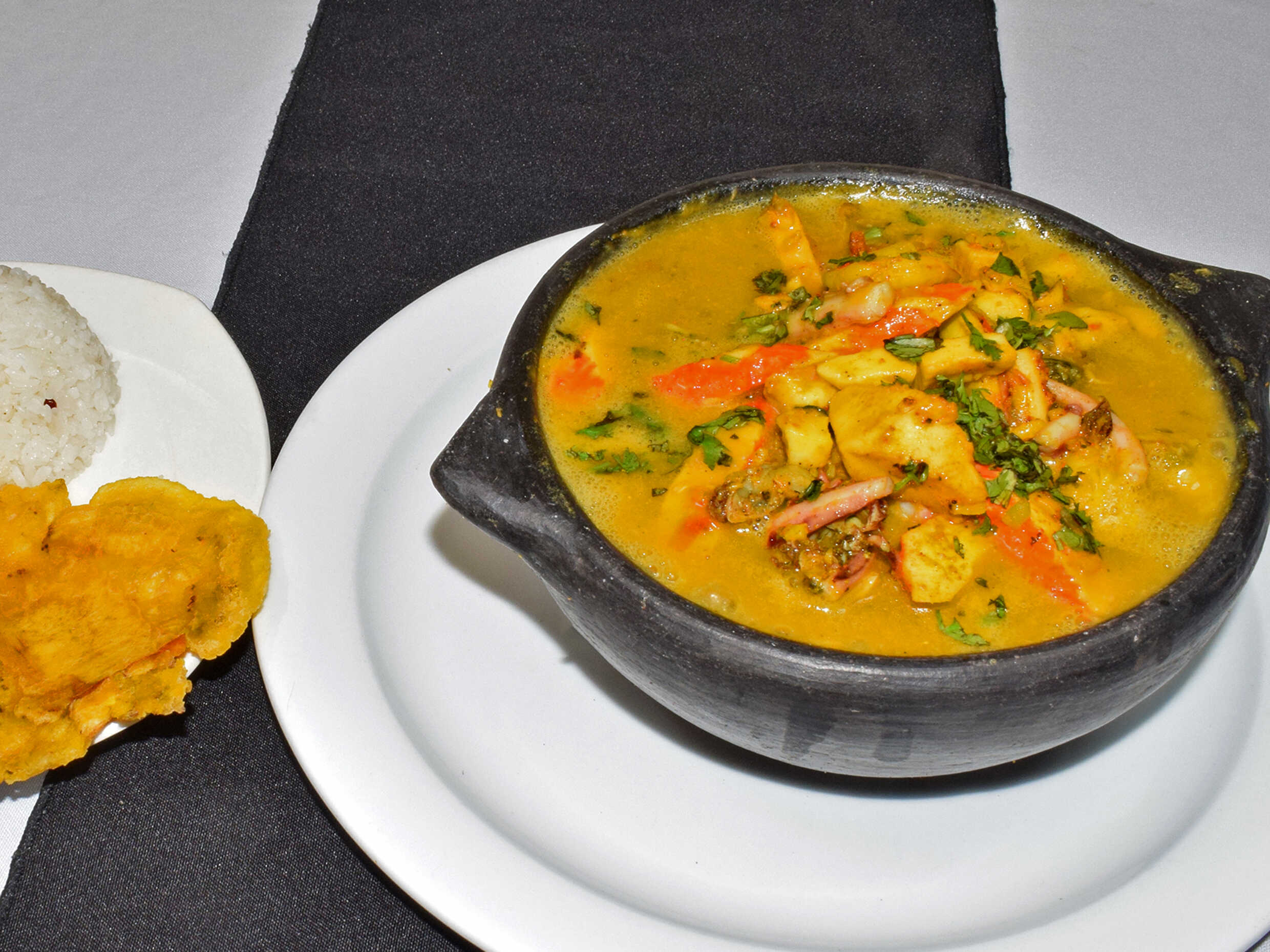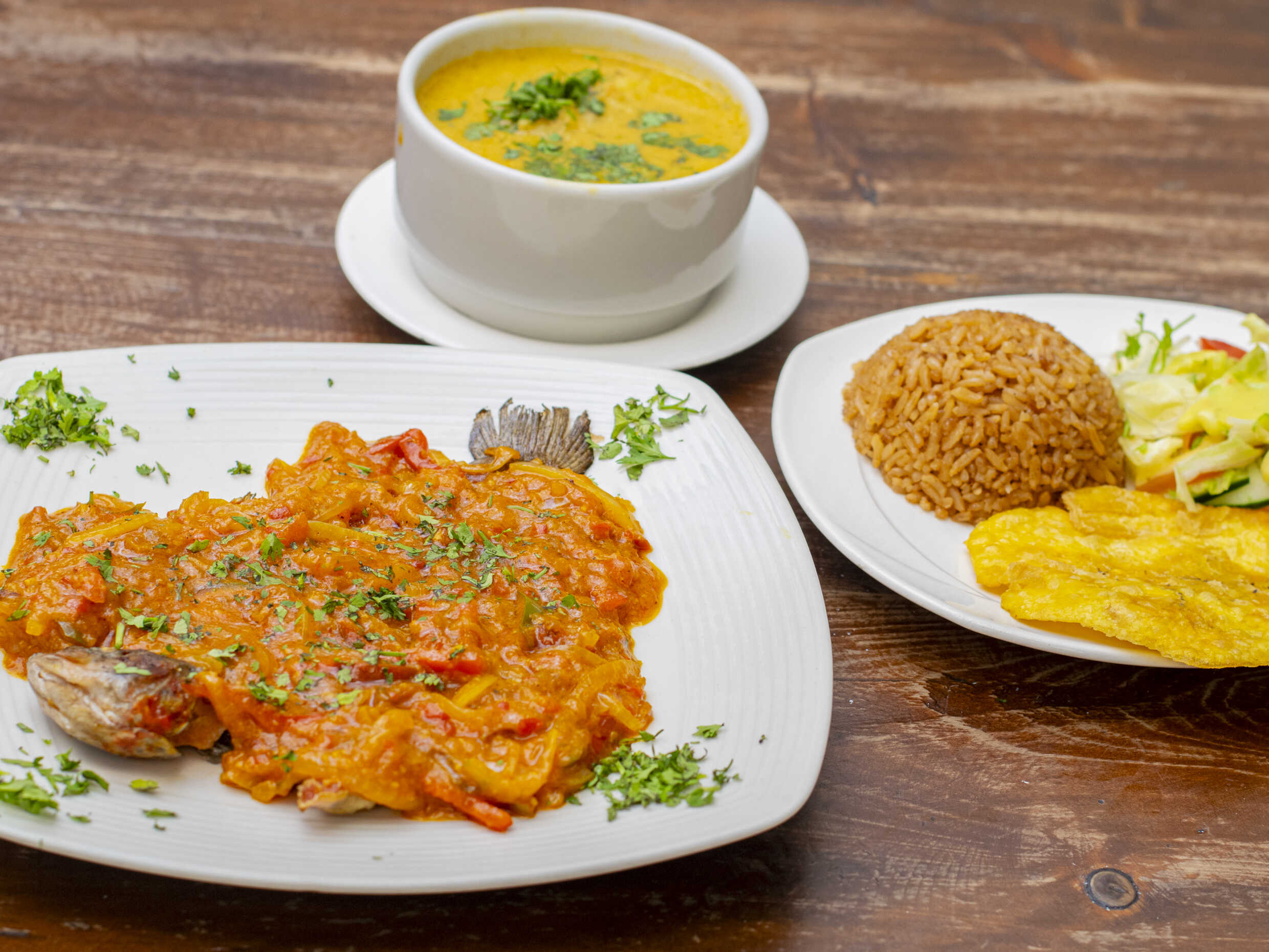 Delicioso sancocho de pescado con pulpo, calamar, almeja, palmitos de cangrejo y camarones, y una posta de pescado bagre, acompañado de arroz blanco, tostada de plátano y ensalada.