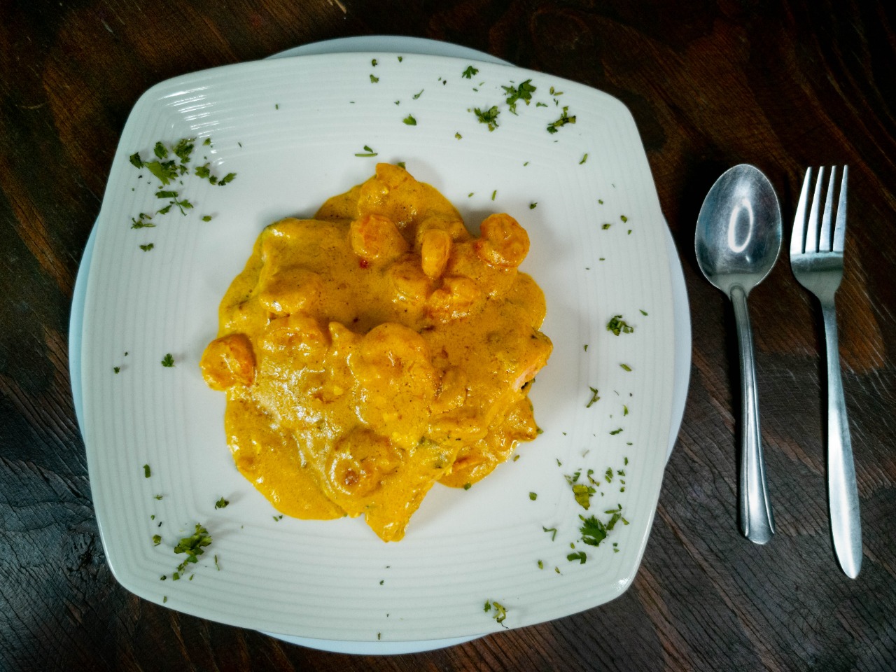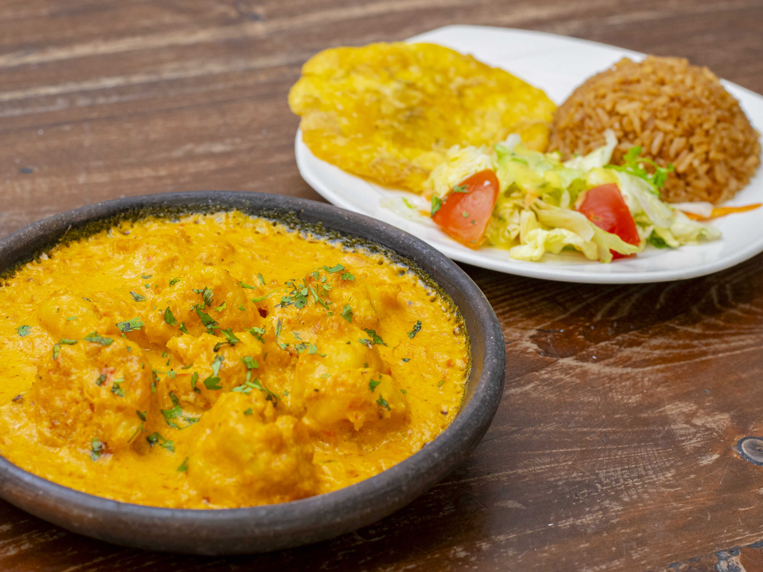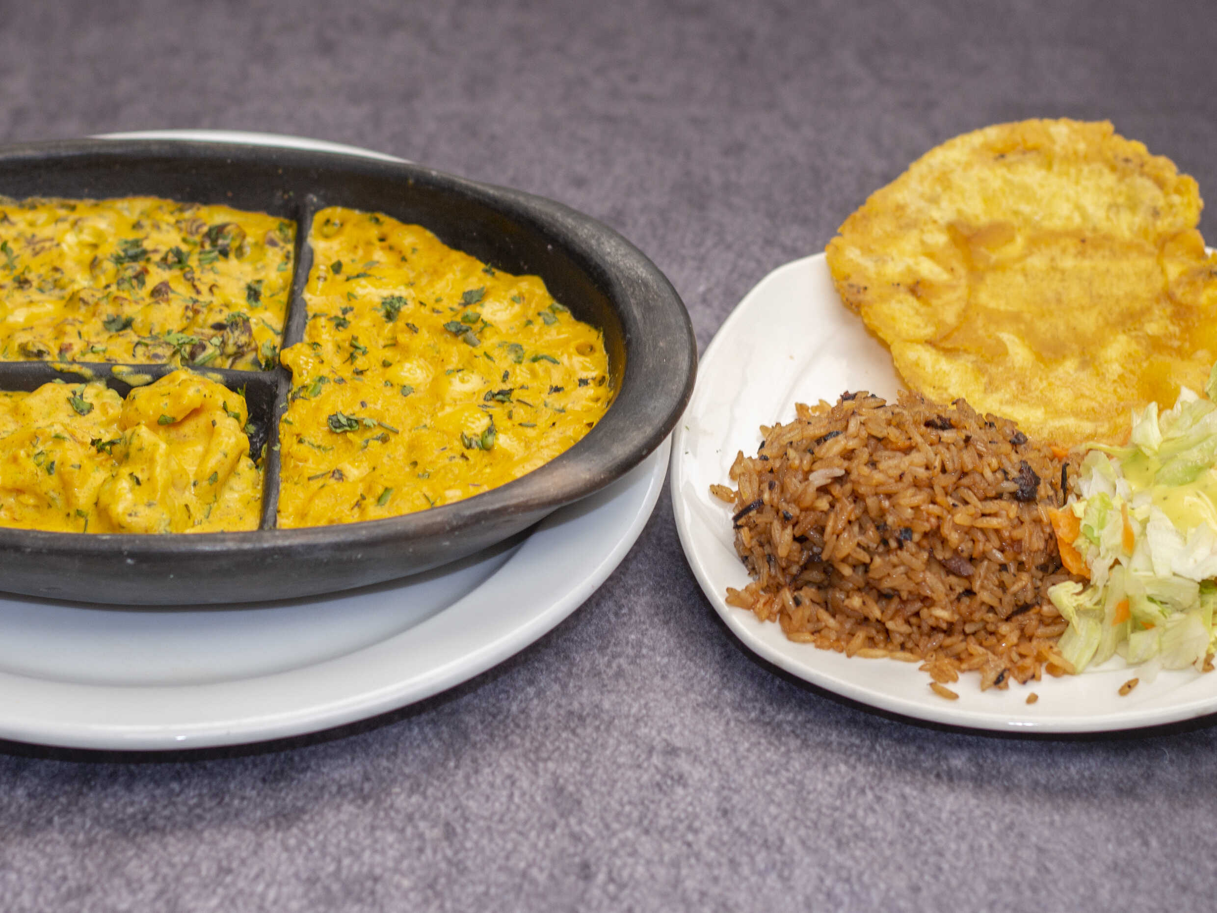 300 Gr de camarón en una salsa cremosa, picante al gusto, acompañado de porción de arroz coco, tostadas de plátano y ensalada.