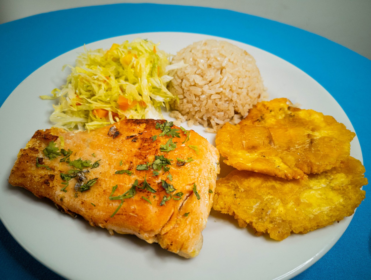 Filete de 300 Gr de salmón a la plancha, acompañado de porción de arroz coco, tostada de plátano y ensalada.