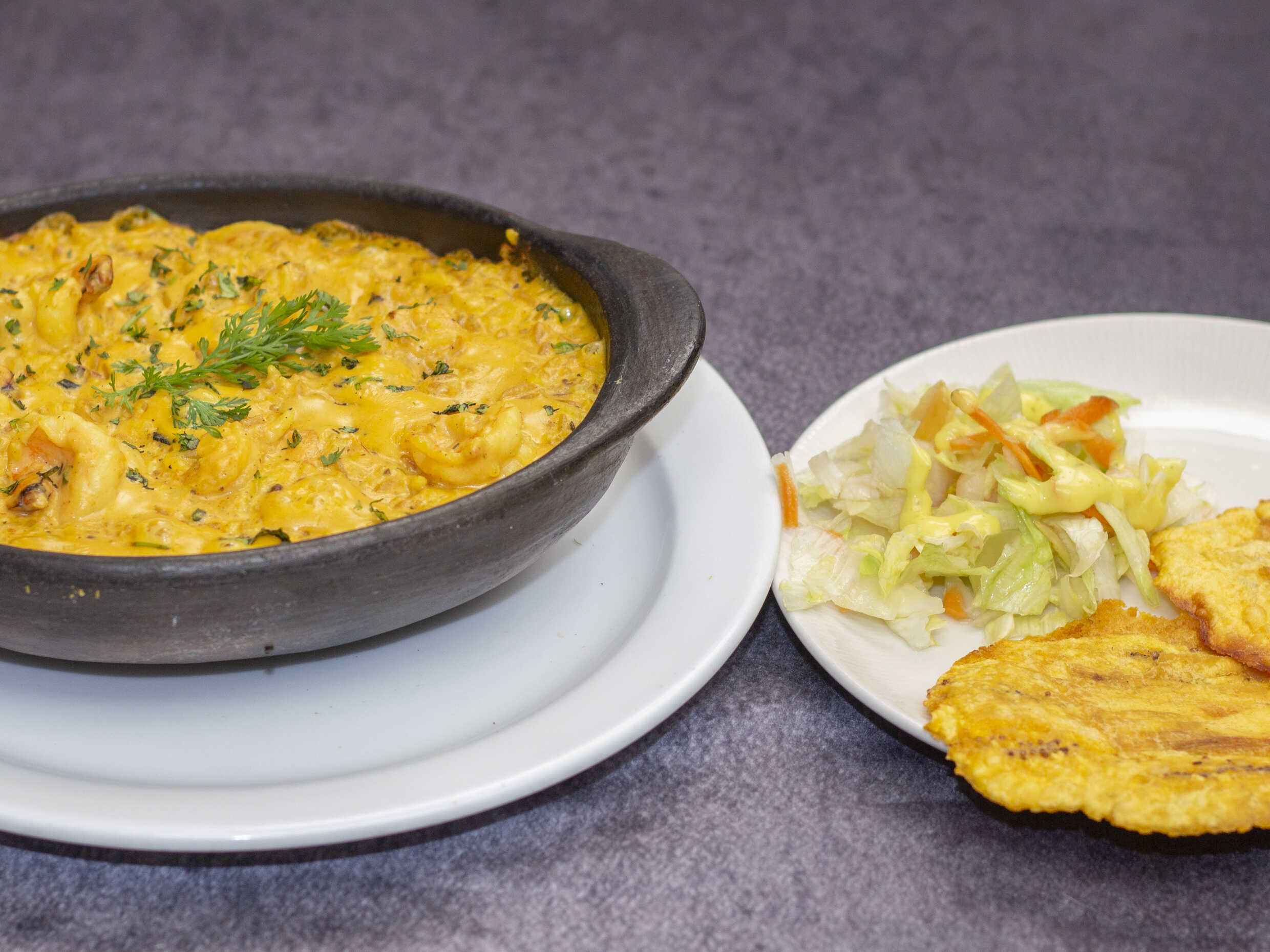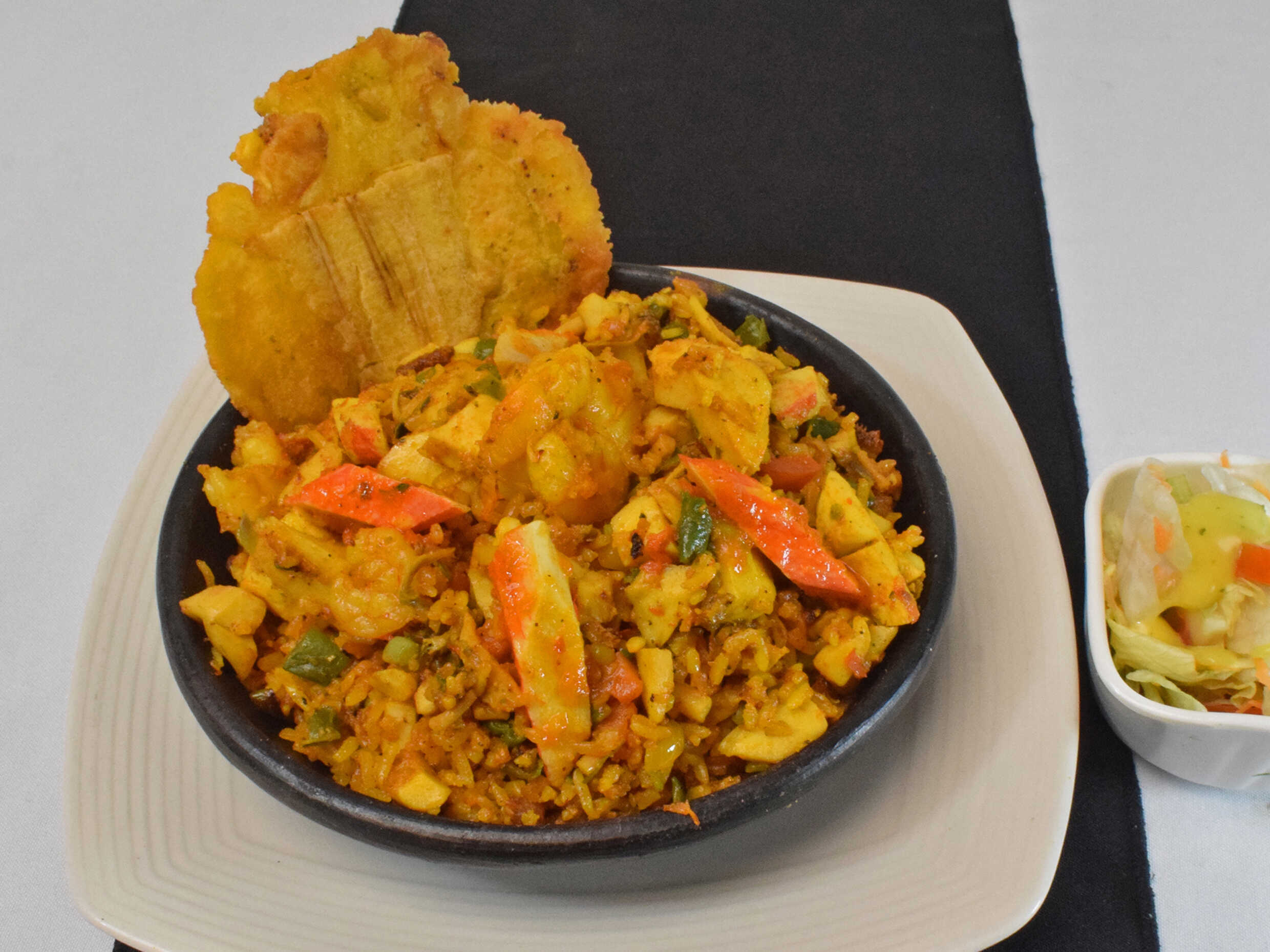 350 Gr entre camarón, langostino, marisco, palmito y pollo, acompañado de arroz coco, tostadas de plátano y ensalada.