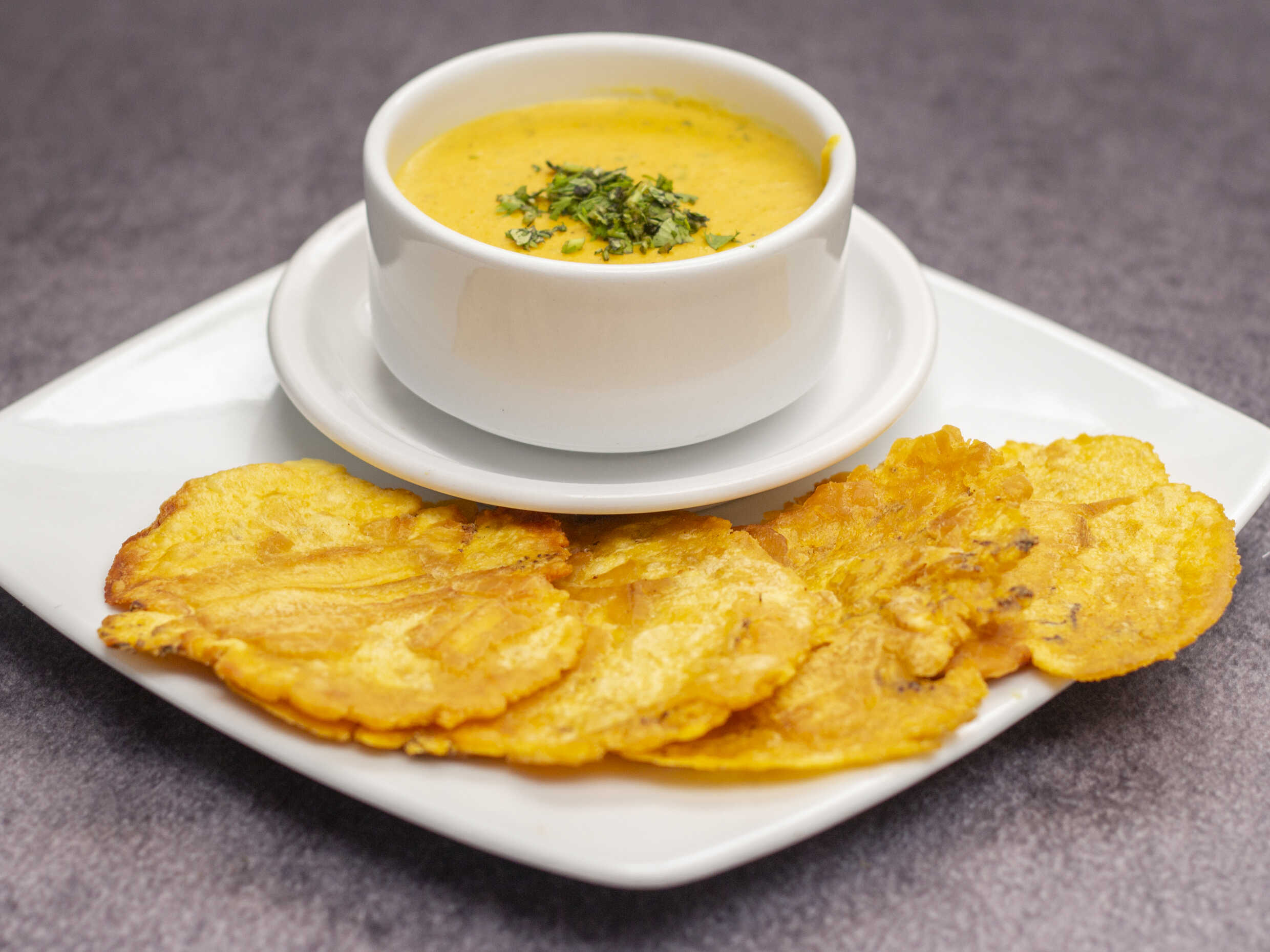 Deliciosa base cremosa de camarón acompañado de 6 unidades de tostadas de plátano.