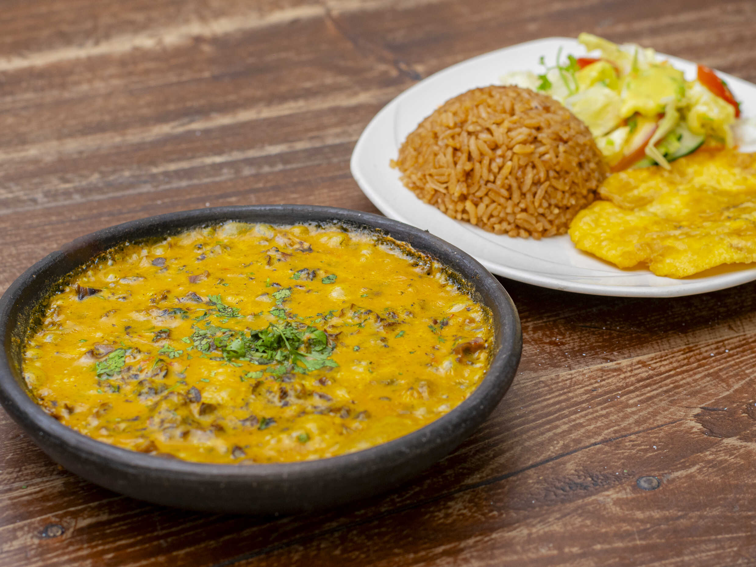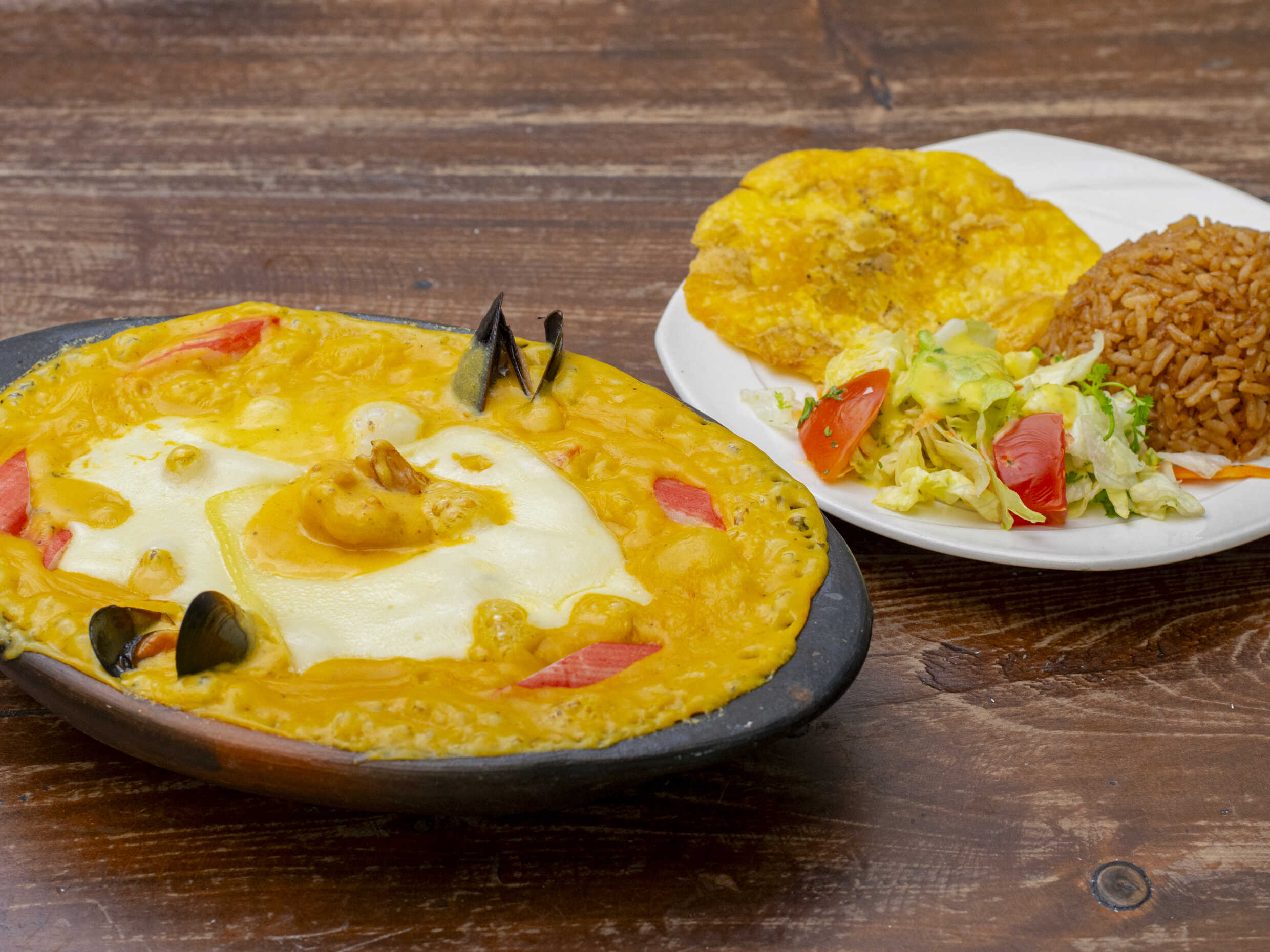 Cazuela con todos los mariscos, langostino, camarón, palmitos y queso gratinado, acompañada de arroz coco, ensalada y tostada.