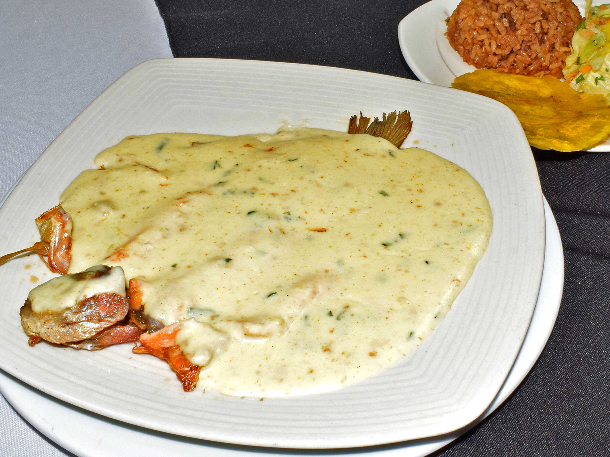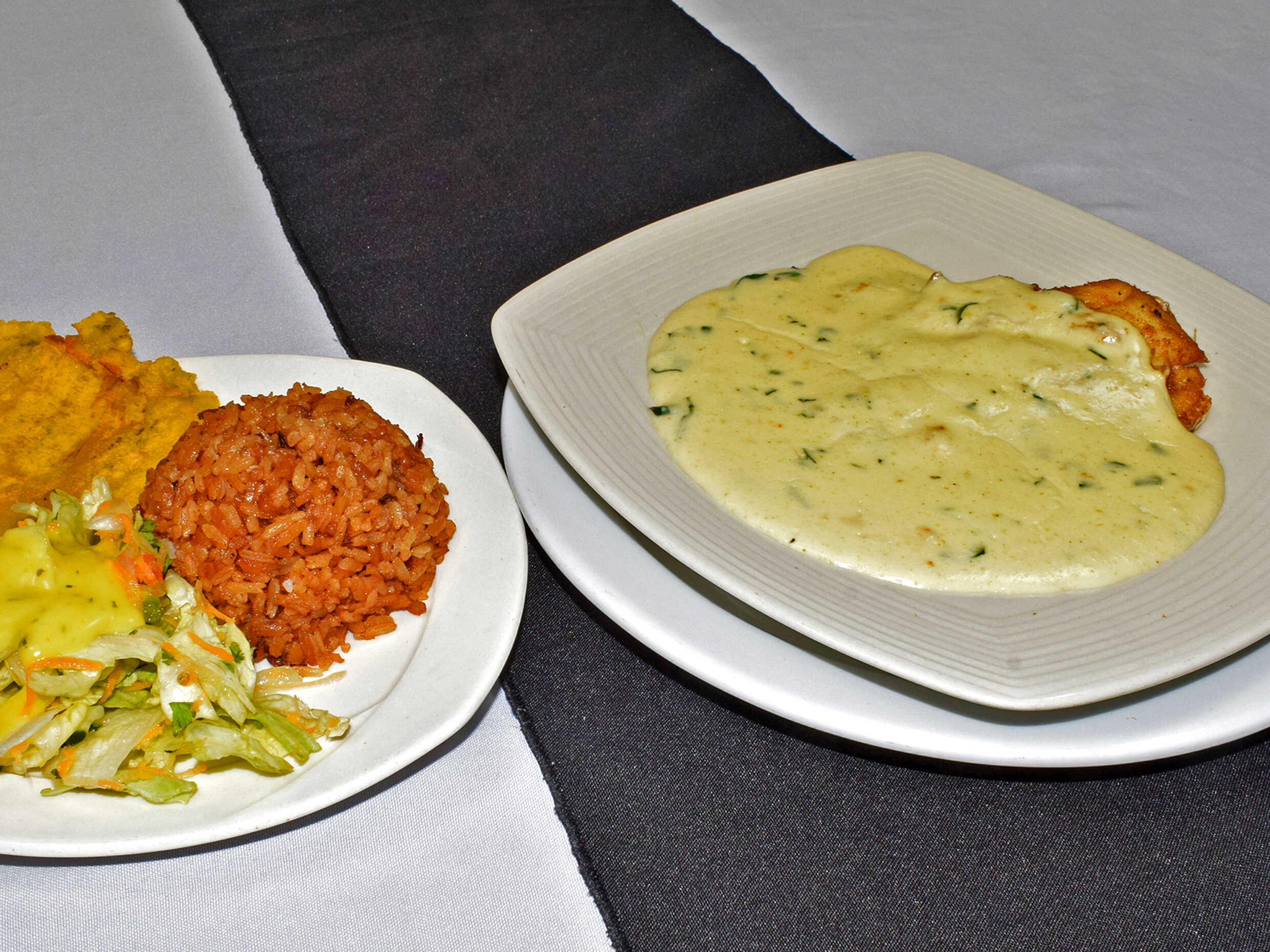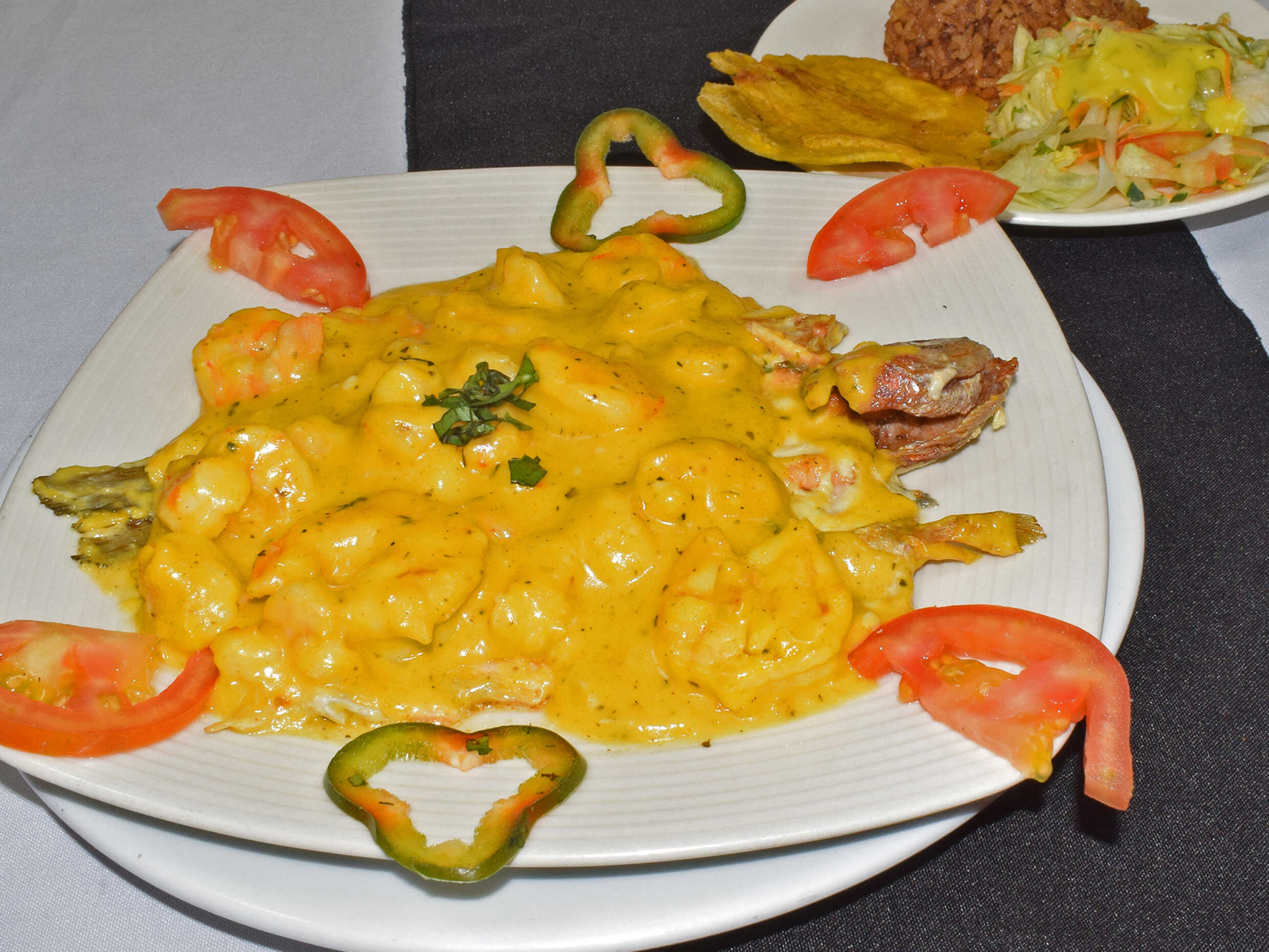 Filete de pescado apanado en una deliciosa salsa de camarones gratinada, acompañado de porción de arroz coco, tostadas de plátano y ensalada.