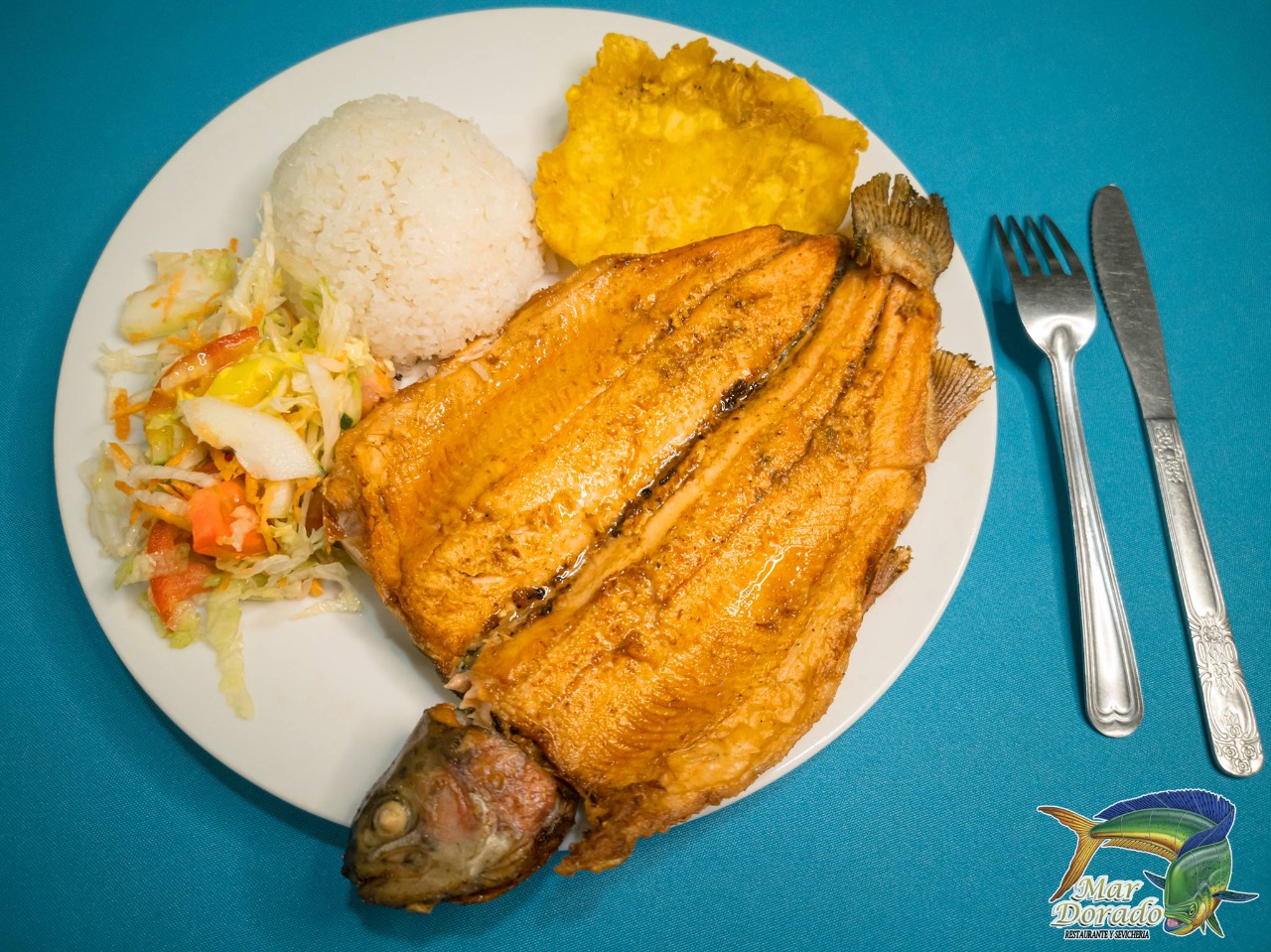 Una posta de pescado frito apanada con salsa de mariscos, acompañado de arroz blanco, tostada de plátano, ensalada y un sancocho de pescado.