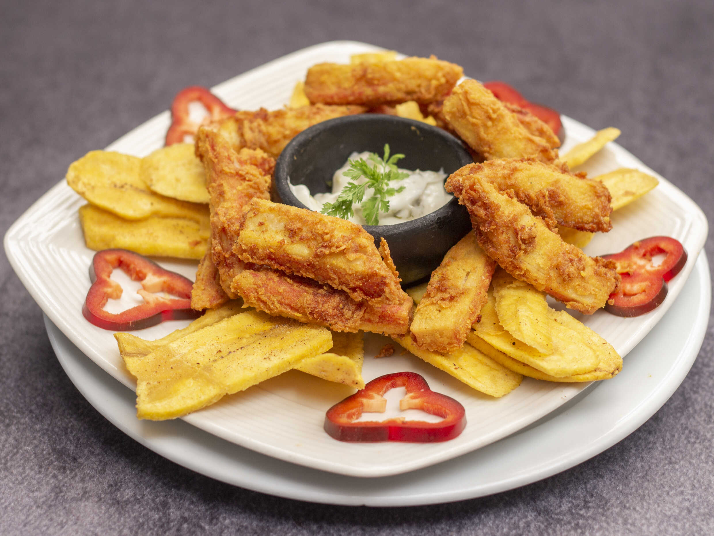 4 Unidades de pescado, tostadas de plátano con una deliciosa salsa de pescado.