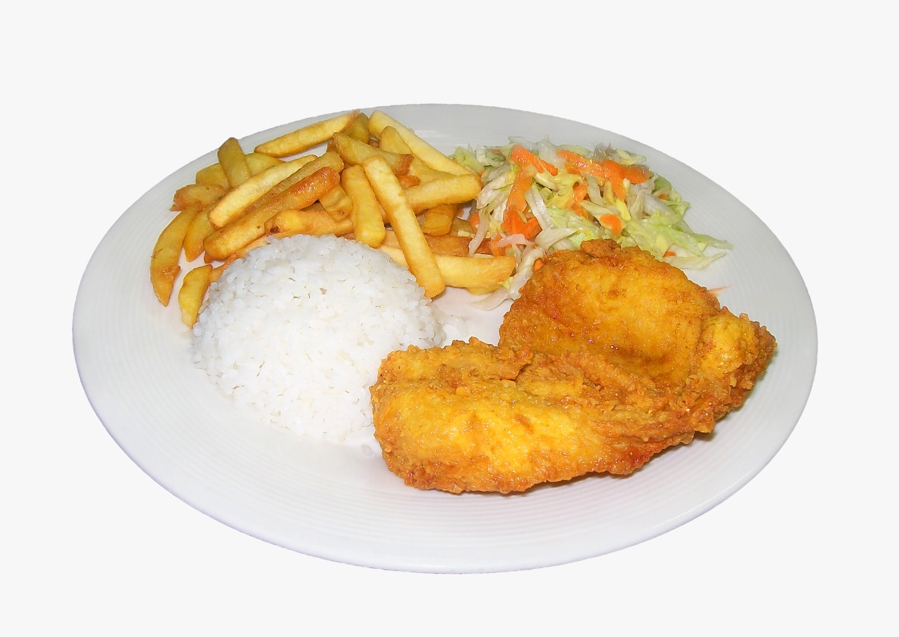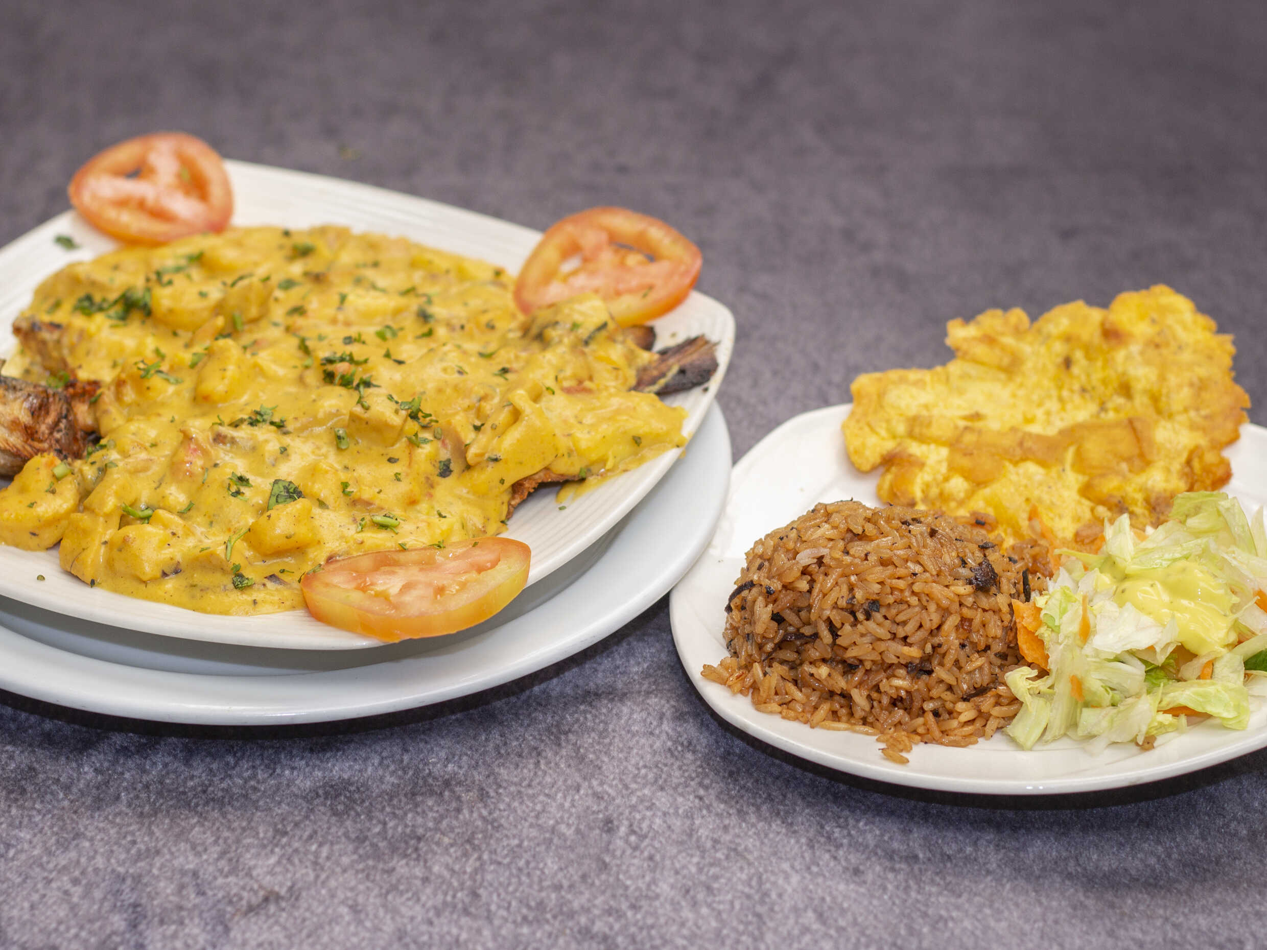 Filete de pescado apanado en una deliciosa salsa con todos los mariscos, acompañado de porción de arroz coco, tostadas de plátano y ensalada.