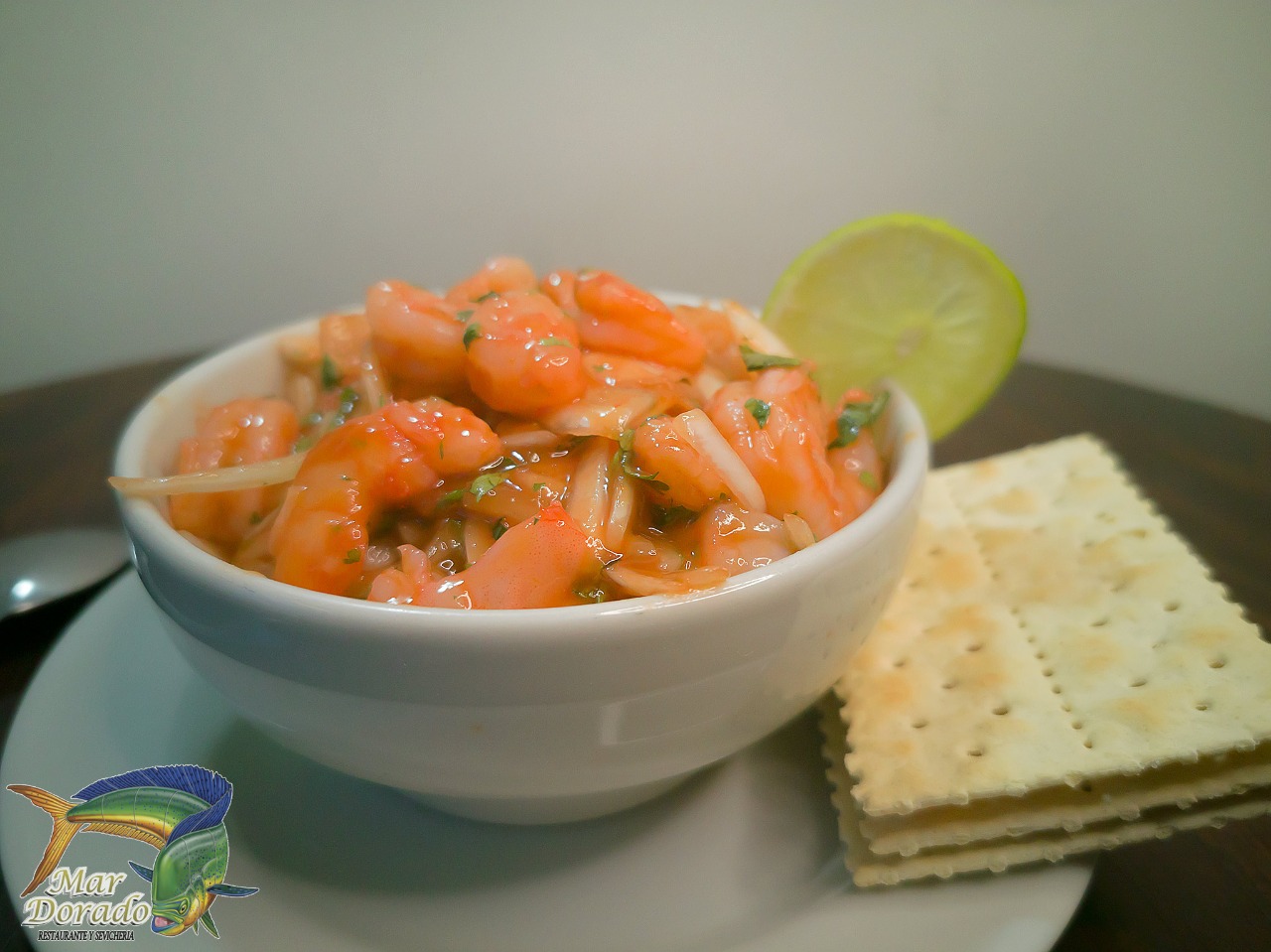 8 langostinos en salsa roja o rosada, cebolla acompañado de galletas de soda o tostadas de plátano y bebida