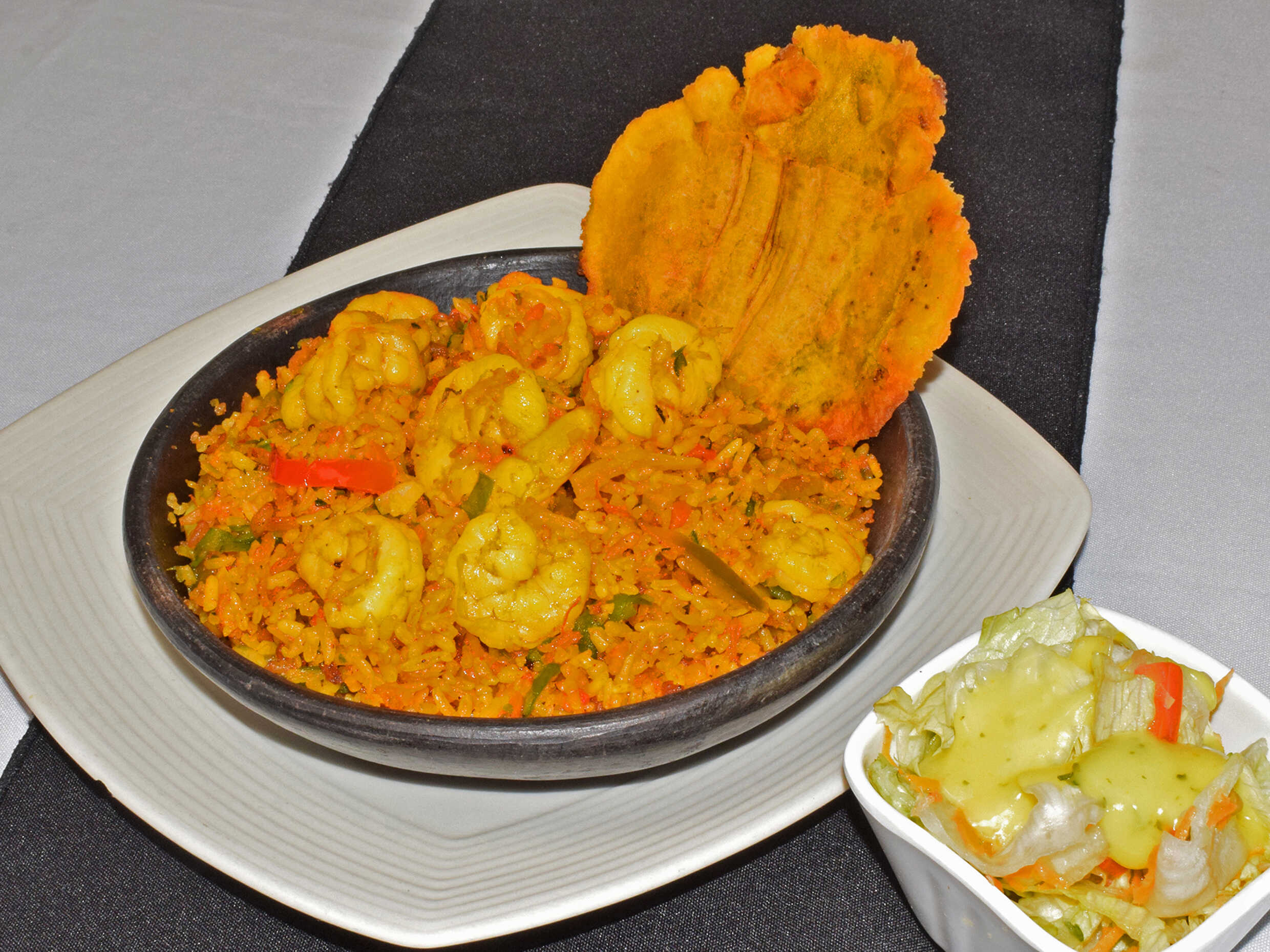 Arroz mixto con todos los mariscos, una deliciosa salsa con camarones, langostinos, mejillones, acompañado de ensalada y tostadas de plátano.