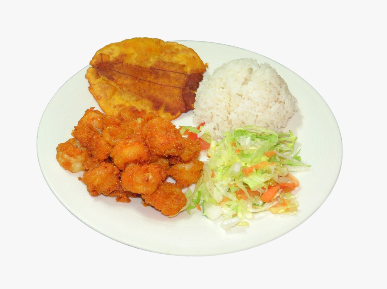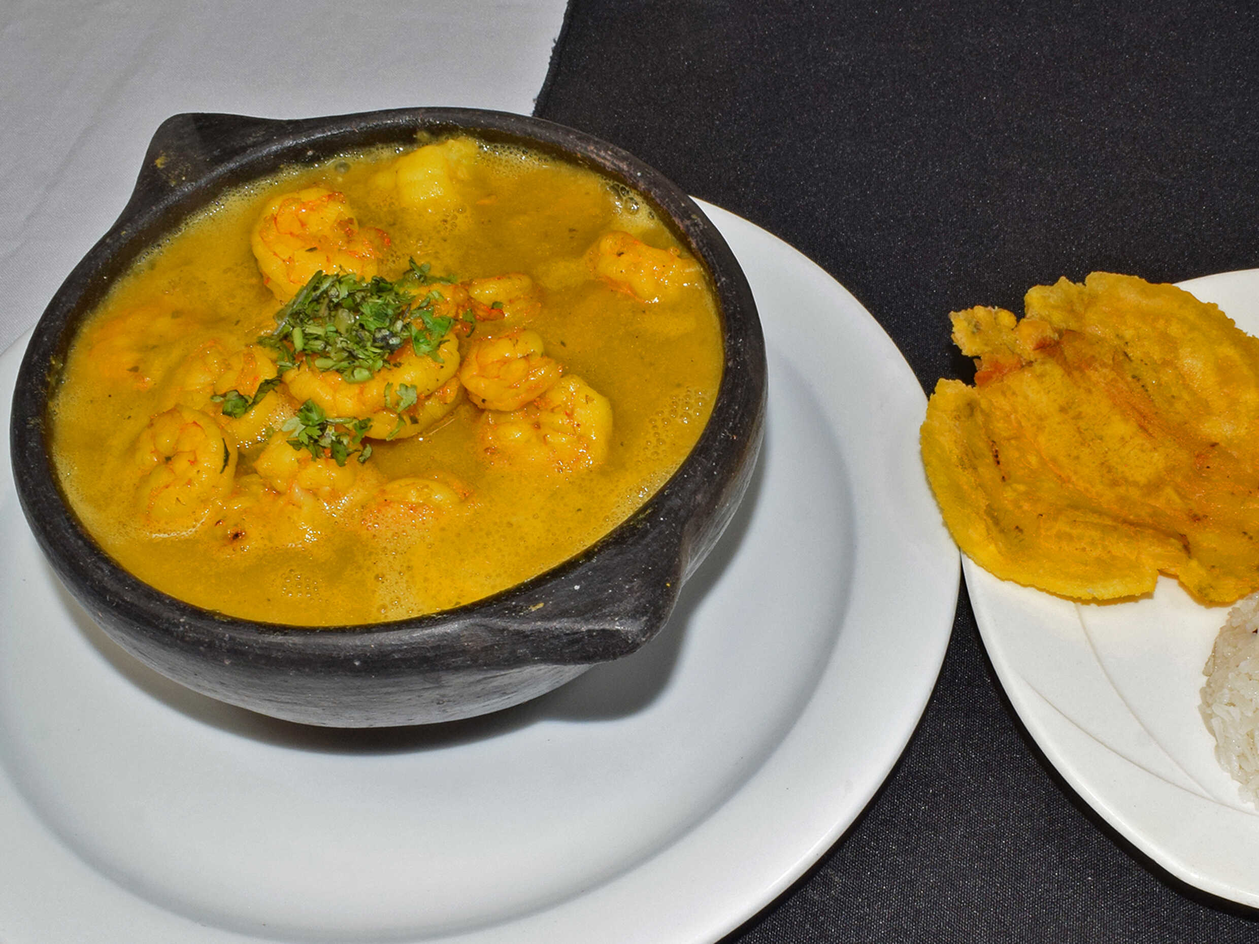 7 Unidades de langostino en una deliciosa salsa de jaiba, acompañados de porción de arroz coco, tostadas de plátano y ensalada.
