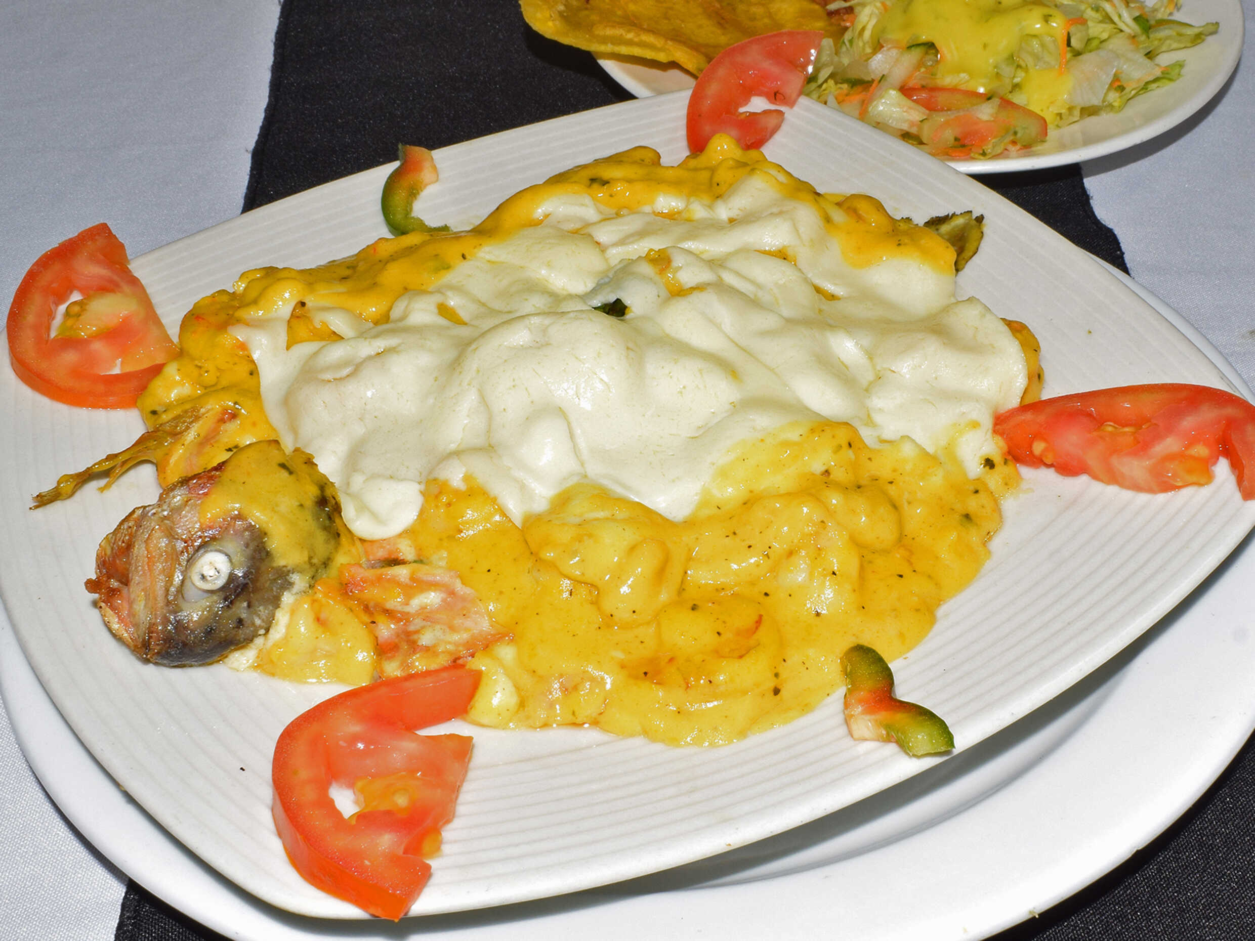 Trucha a la plancha con una deliciosa salsa cremosa más queso loncha, acompañada de arroz de coco, ensalada, tostada.