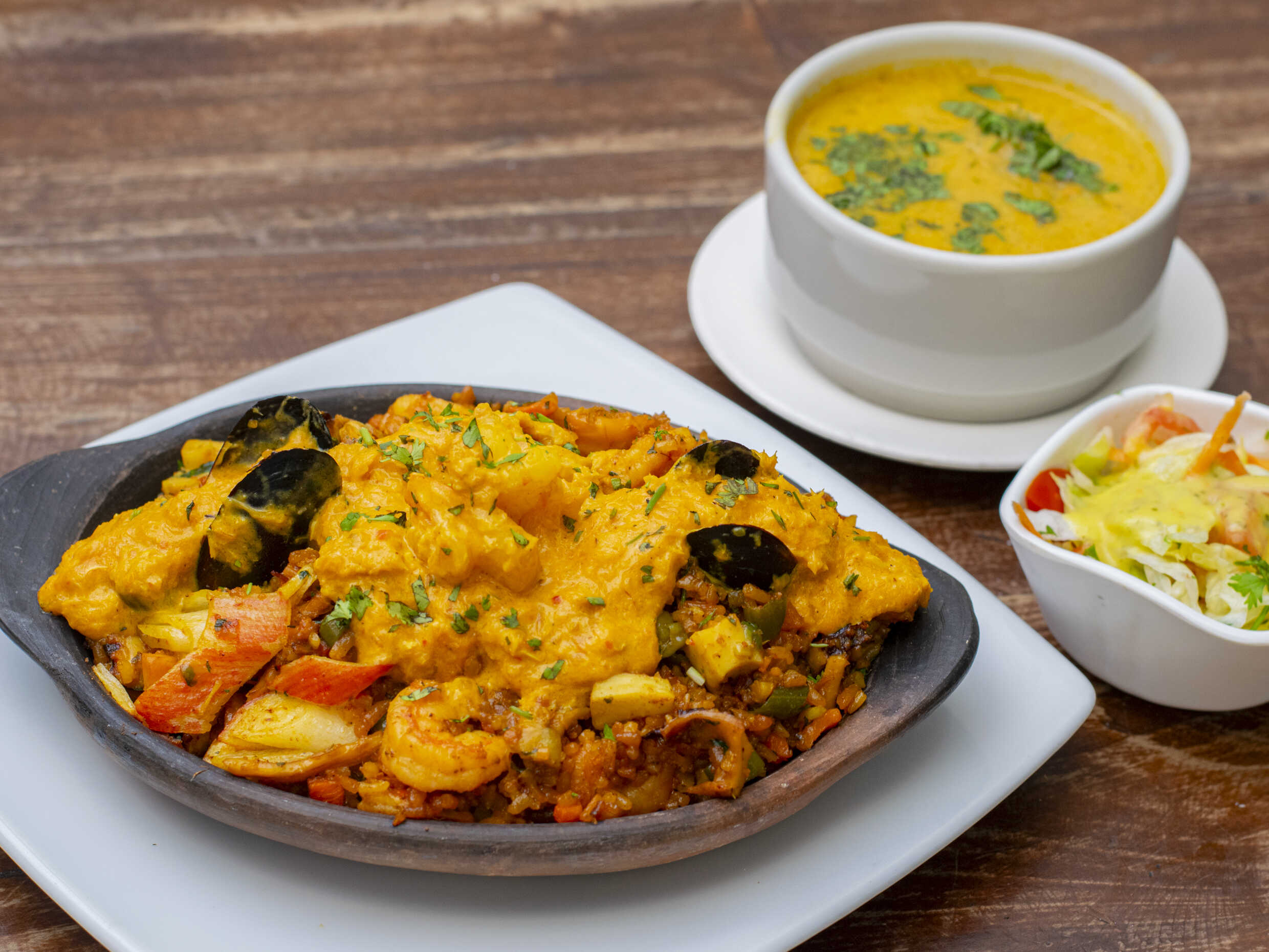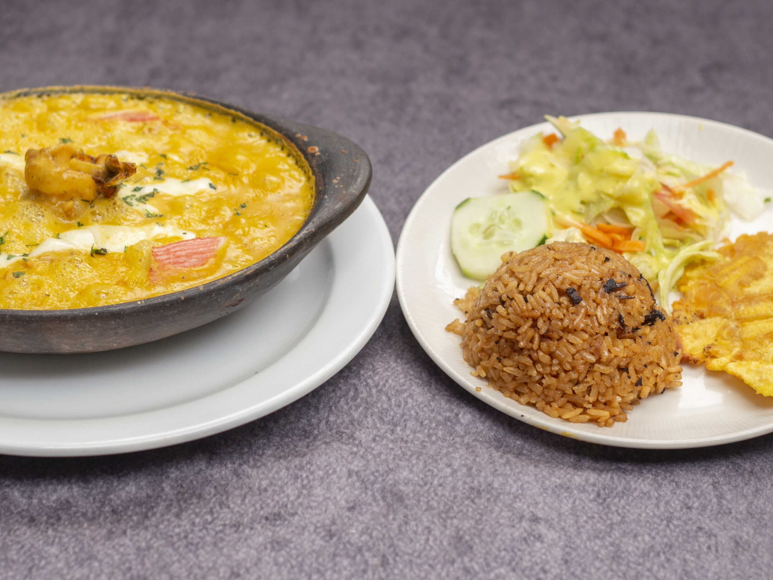Arroz mixto en una deliciosa salsa criolla con langostinos y mejillones, picante al gusto, acompañado de tostada, ensalada y un delicioso sancocho de pescado.