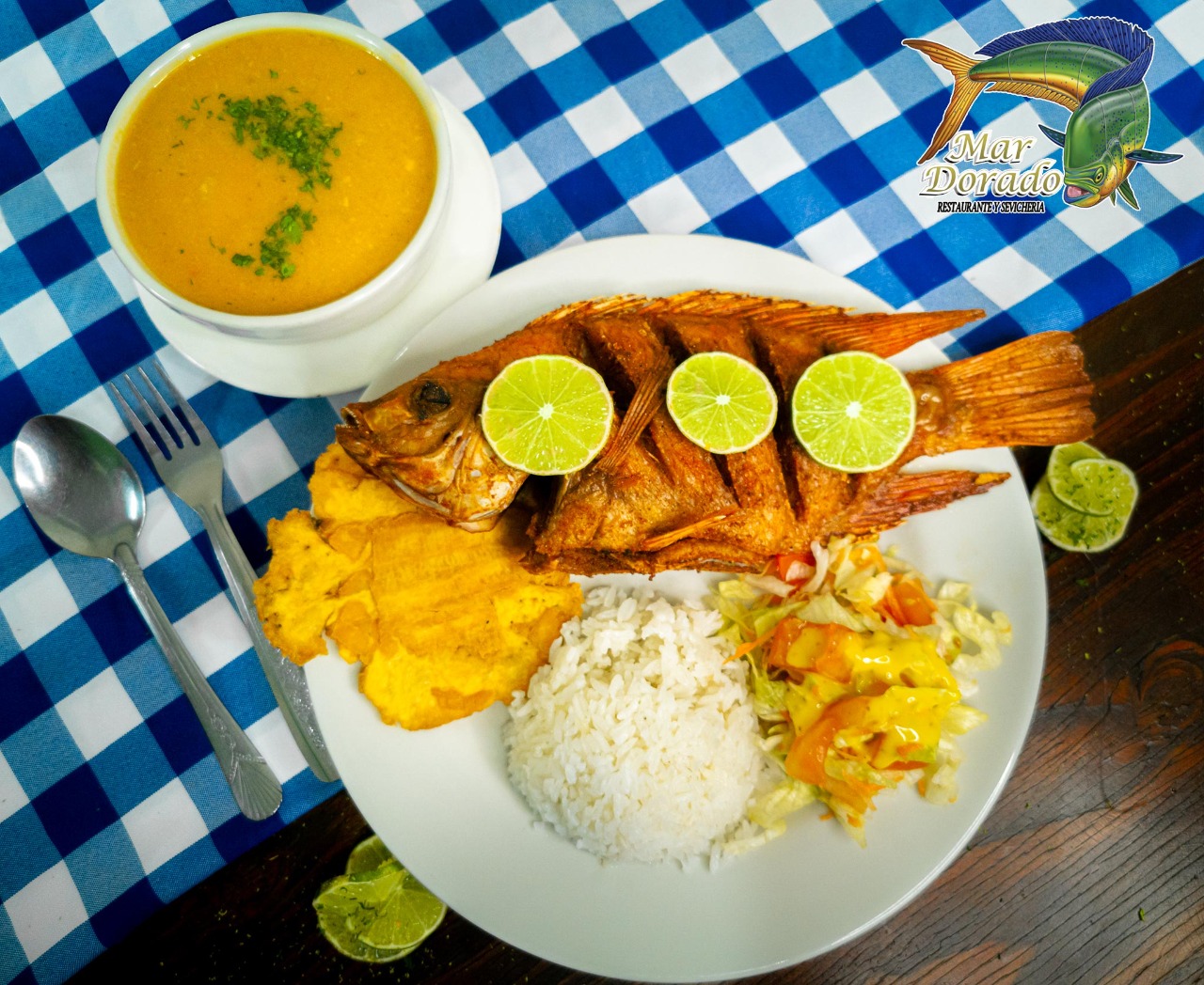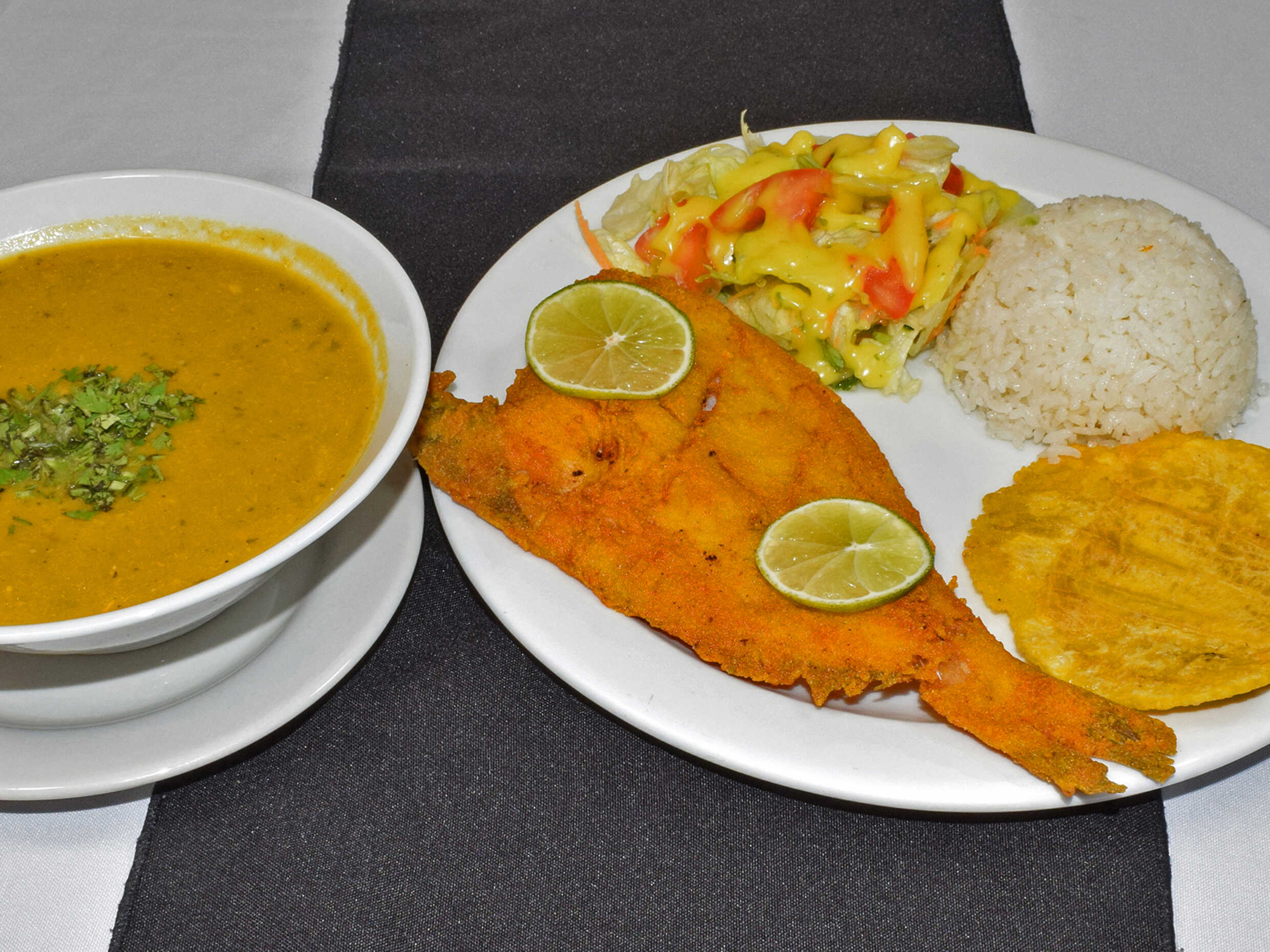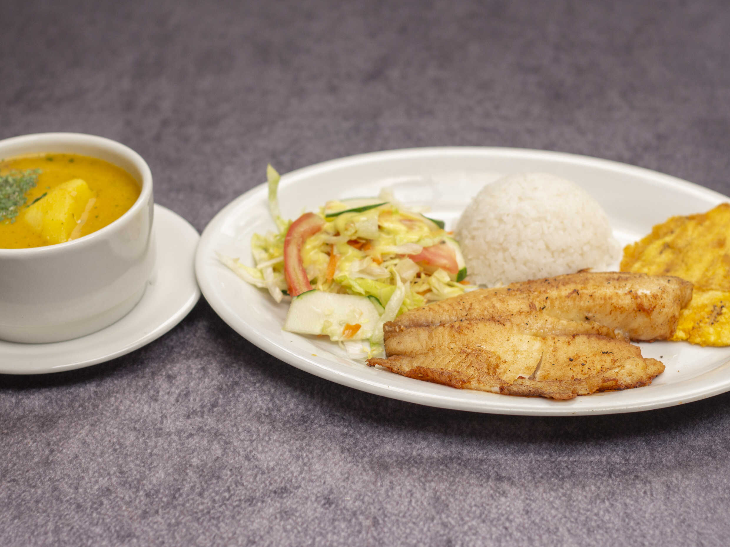 2 tilapias fritas acompañados de arroz blanco, tostada de plátano, ensalada, y un delicioso sancocho de pescado.