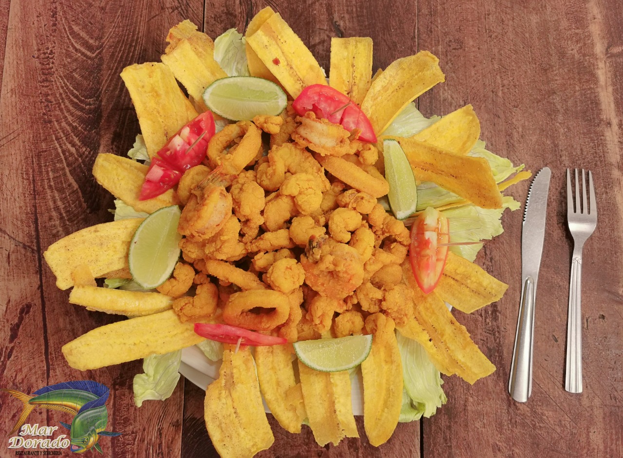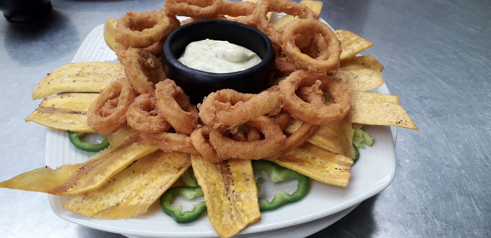 350 Gr entre pulpo, calamar, almeja, palmitos de cangrejo, camarones y langostinos, con una deliciosa salsa tártara, acompañado de moneditas de plátano.