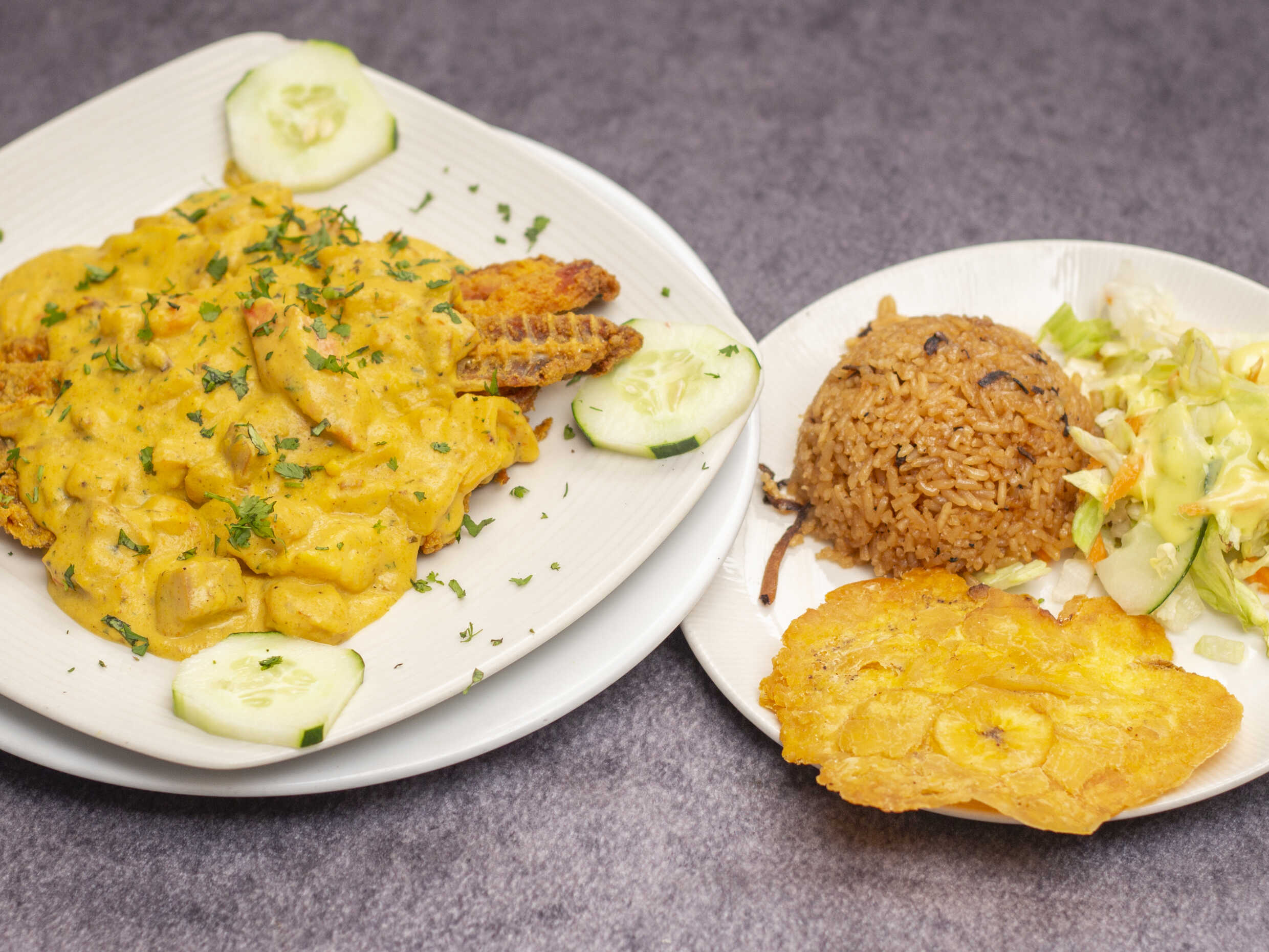 Pescado de 450 gr en una deliciosa salsa con todos los mariscos, acompañado de arroz coco, tostadas de plátano y ensalada.