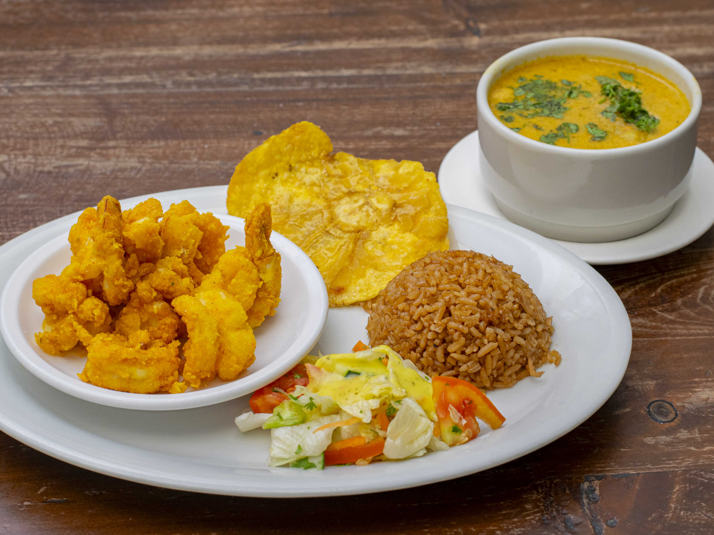 7-9 Unidades de langostinos apanados más sancocho de pescado, acompañado de porción de arroz coco, tostadas de plátano y ensalada.