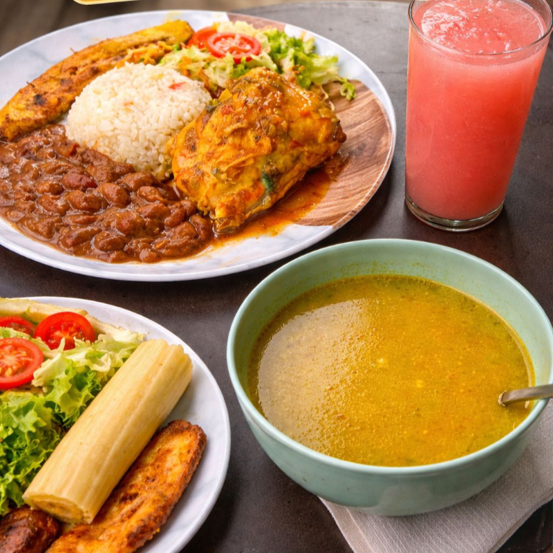 Completo almuerzo del día que incluye proteína a elección, principio, arroz, ensalada, maduro y limonada.