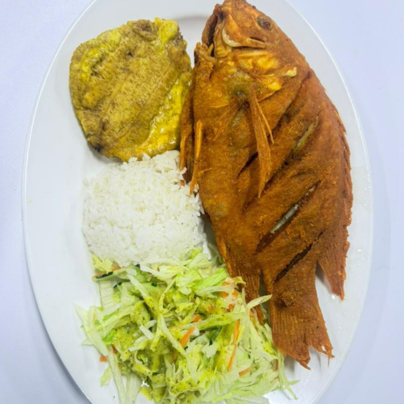 Delicioso pescado preparado al vapor con guiso casero o frito a la perfección, acompañado de sancocho.