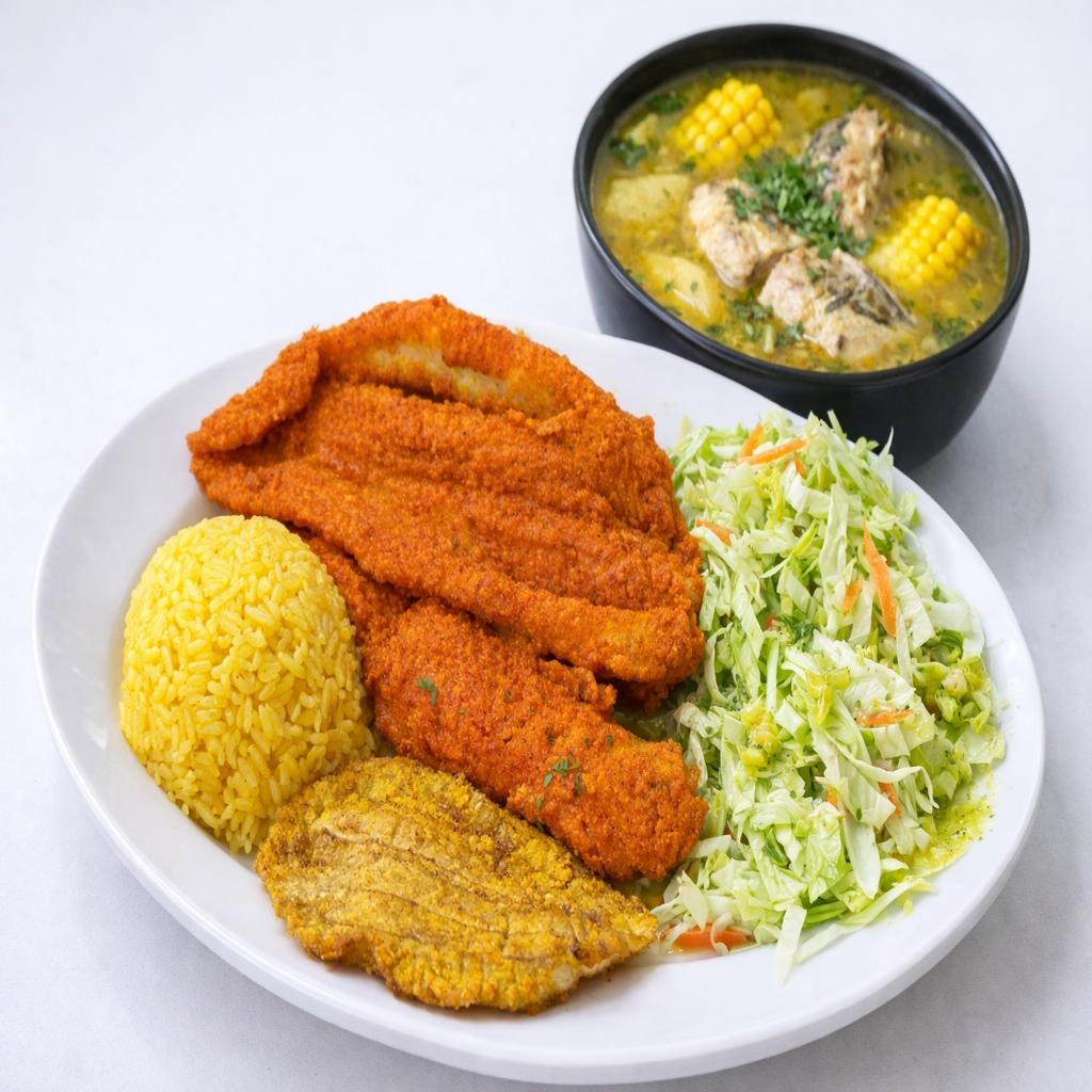 Filete de pescado apanado y frito, servido con sancocho y acompañamientos de la casa.