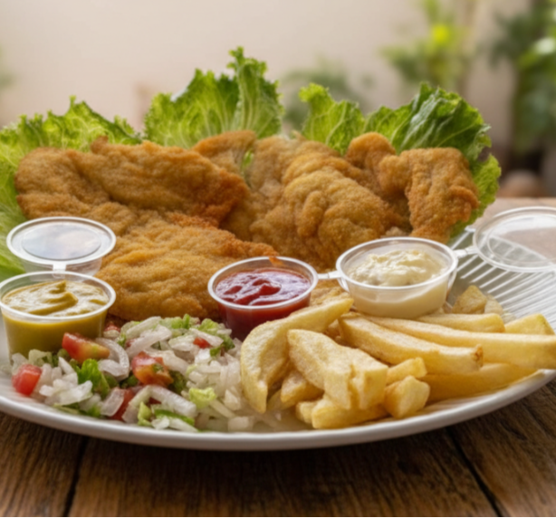 Chuleta de pollo asada o apanada a eleccion acompañada de papas a las francesas y deliciosa ensalada a disponibilidad del dia