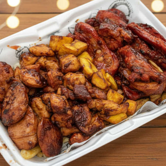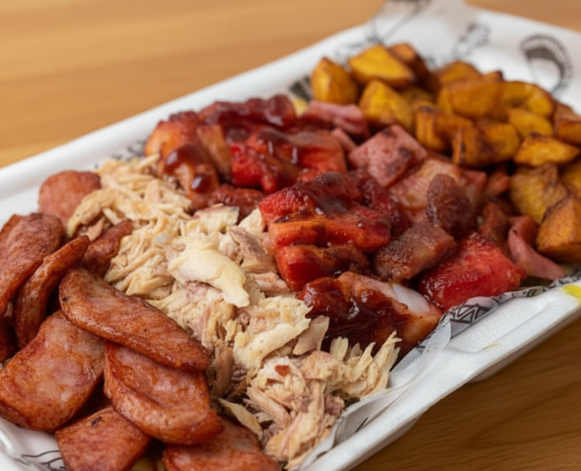 200 gramos de costilla a la BBQ, 80 gramos de pollo desmechado, 100 gramos de tocineta, Salchicha Ranchera, 80 gramos de maduro, salsa rosada, salsa de ajo, salsa de tomate y salsa de piña a eleccion
